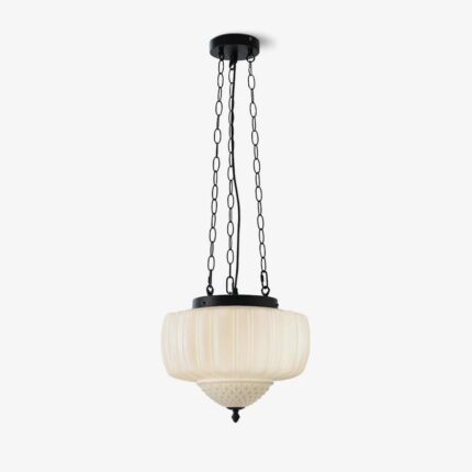 The Marbre Stripe Pendant Light showcases a scalloped shade in striking black-and-cream vertical stripes, made from richly textured embroidered fabric.