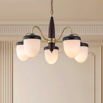 The Hazelnut Wood and Glass Chandelier combines the warmth of rich walnut wood with the clarity and elegance of glass.