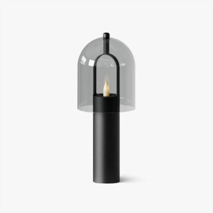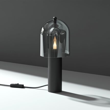 Table lamp with cylindrical base in black metal, topped with a shade in smoked mouth-blown glass. Black textile cable. Black