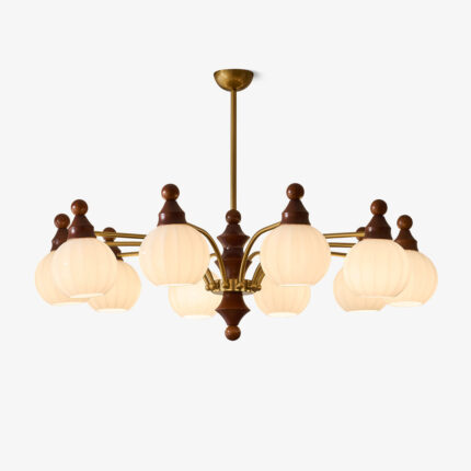 The Ophelia Blossom Chandelier by Vakkerlight features delicately shaped glass shades reminiscent of blooming flowers, paired with warm walnut and