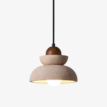 The Zenith Tier Pendant Lamp by Vakkerlight features a striking layered design with natural travertine and a wooden accent. Its