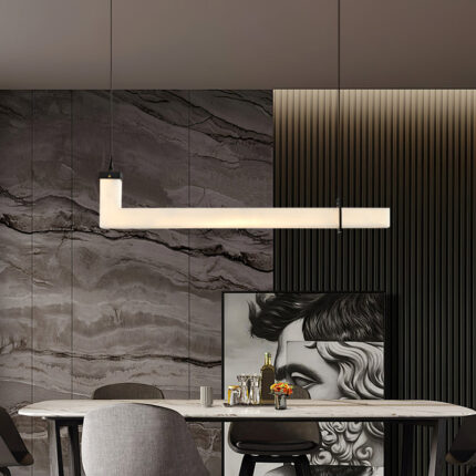 The L-Axis Pendant features a clean, angular silhouette—evoking architectural lines and spatial clarity. Its alabaster-like diffuser emits a soft, linear