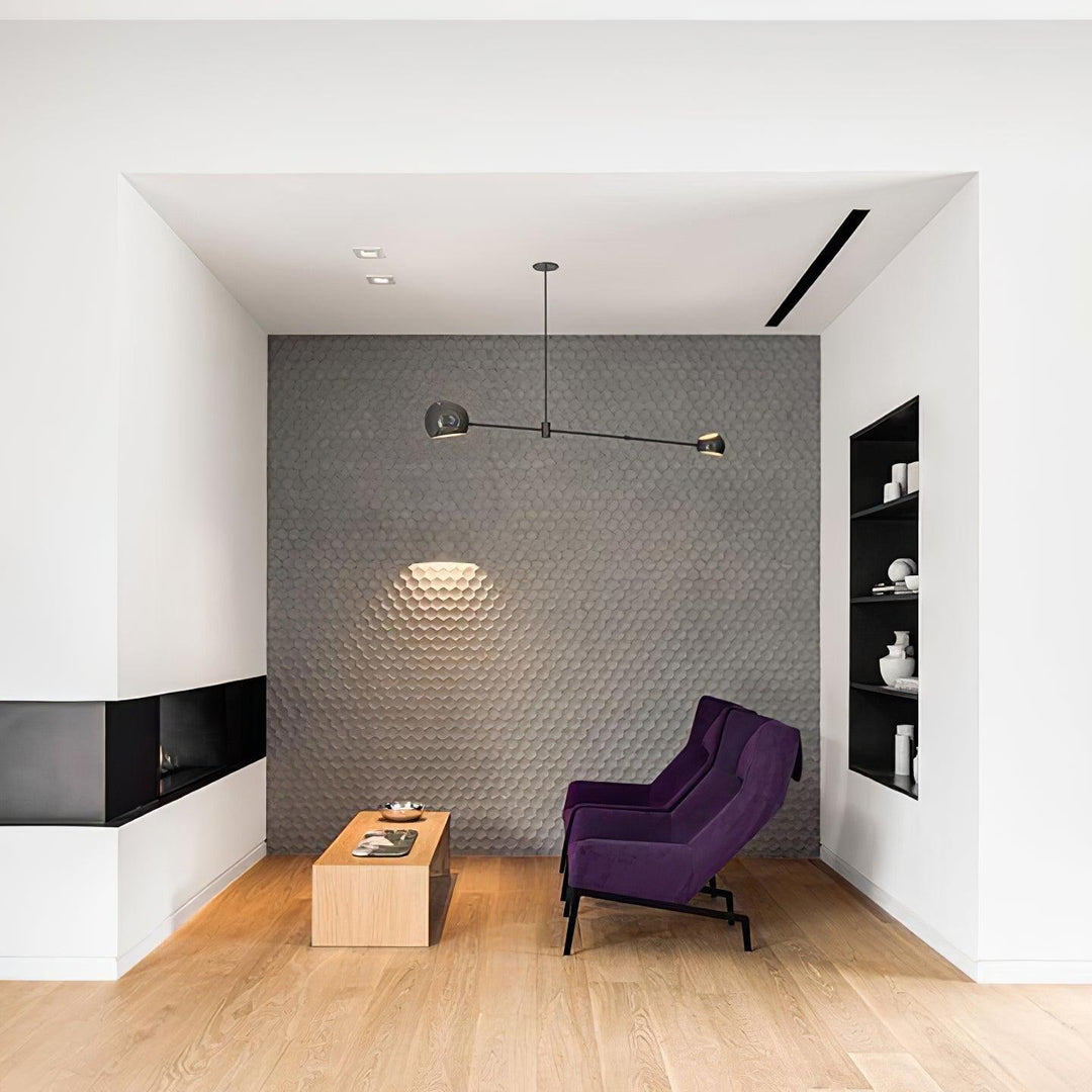 The Acaba is comprised of two different-sized glass lampshades mounted on opposite ends of a single steel rod. Suspended by an off-center counterweight, each shade rotates 320 degrees with openings at the top and bottom for maximized light. This suspension fixture also works well when installed in multiples.