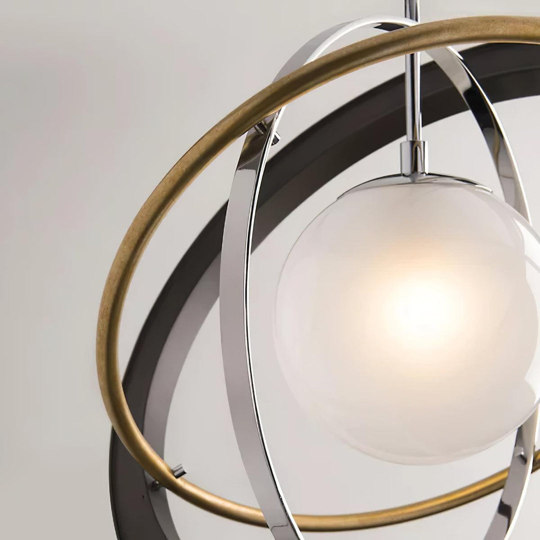 The Apogee Lamp brings a brilliant and stellar display to your home interior. Its silhouette combines a frosted glass shad, orbited by asymmetrical rings of varying sizes and finishes.
