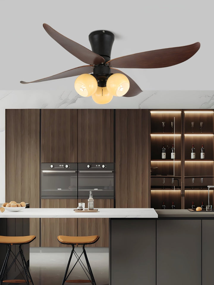 The Arbora Bloom Ceiling Fan Light channels organic beauty through petal-shaped wooden blades and soft glass globes that echo blooming flowers. Its dark wood grain and matte black base add a grounded sophistication, while the multi-light design ensures bright, even illumination—ideal for cozy bedrooms, tranquil dining rooms, or nature-themed interiors.