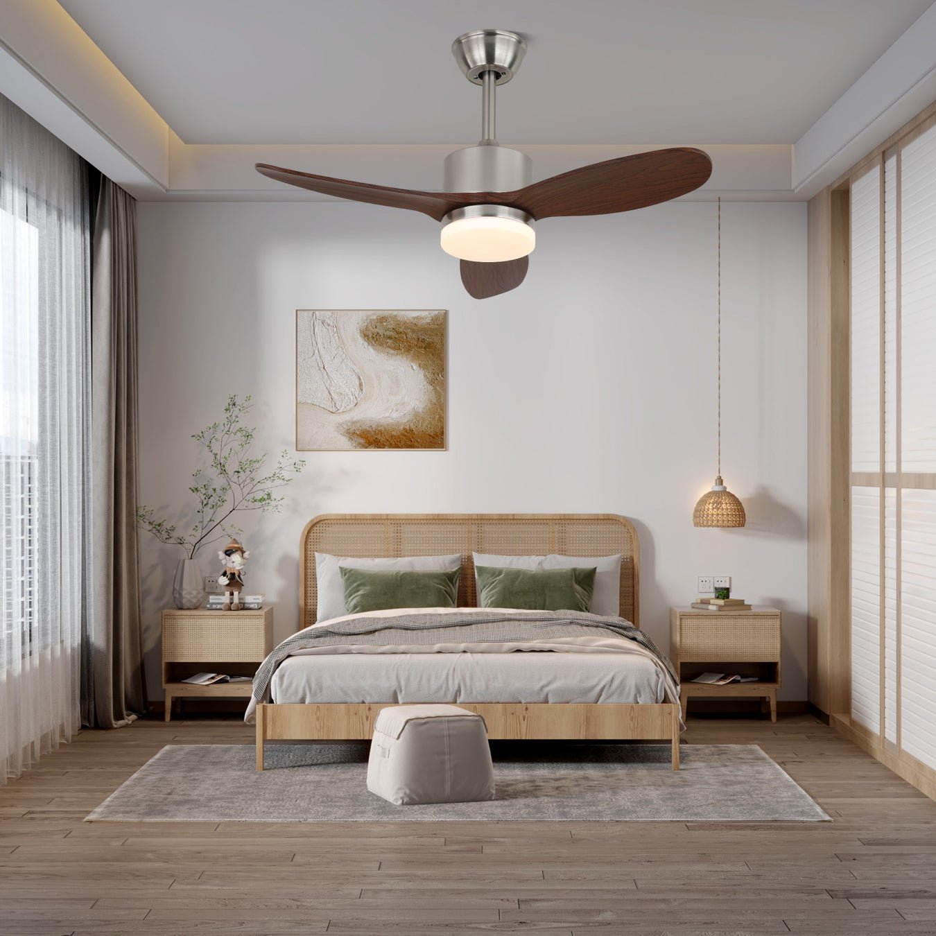 The Arlo Ceiling Fan Light by Vakkerlight merges modern design with seamless utility. Its elegant wooden blades and brushed nickel accents create a sleek aesthetic, while the integrated LED light offers warm, ambient illumination. A refined addition to contemporary living spaces.