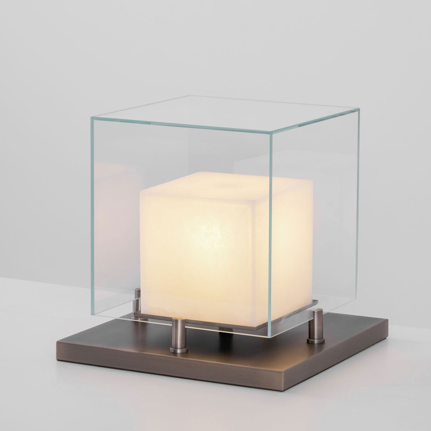 The Arqra Alabaster Table Lamp is a bold exploration of balance and geometry. Encased in a transparent glass frame, the shimmering alabaster cube appears to float, while a sleek silver base accentuates its architectural symmetry. The gentle veining of the natural stone imbues each piece with unique character, while its soft glow brings a tranquil and limpid atmosphere to any space. Ideal for a desk, console, or minimalist home, the Arqra Table Lamp is a sculptural addition, showcasing the purity of form and the integrity of the material.