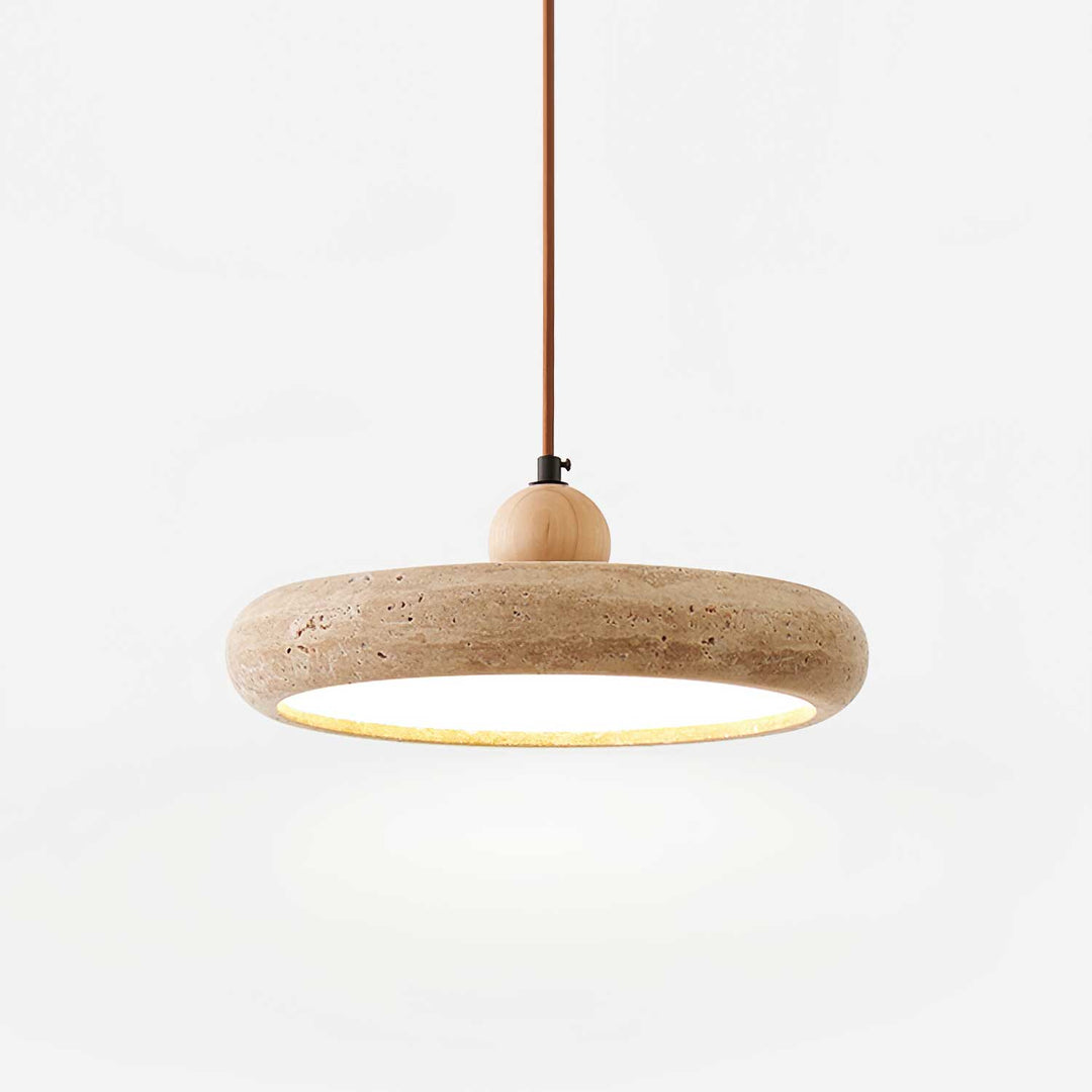 The Aurelio Pendant Light features a perfectly rounded travertine ring that radiates soft, downward light, suspended by a wooden accent sphere and minimal cord. Its sculptural form and earthy tones make it a refined centerpiece for dining tables, kitchens, or lounge areas.