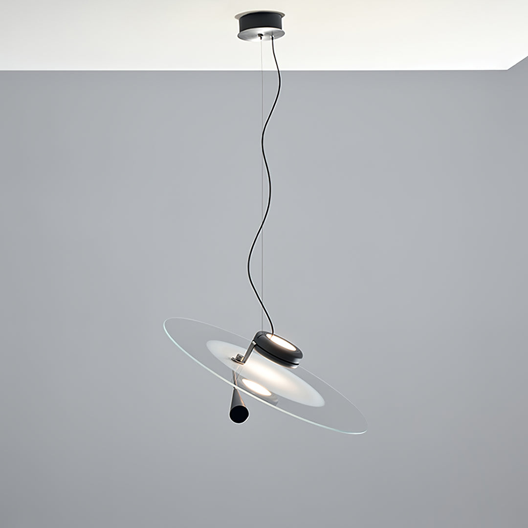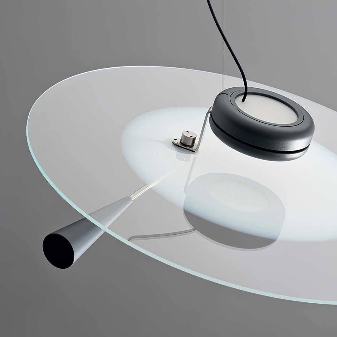 The Bascula Pendant Lamp takes inspiration from the iconic starship Enterprise, featuring a sleek disc suspended by a single cable. The conical counterweight not only balances the lamp, but also directs the light for optimal illumination. Experience modern design and efficient functionality with this unique piece.
