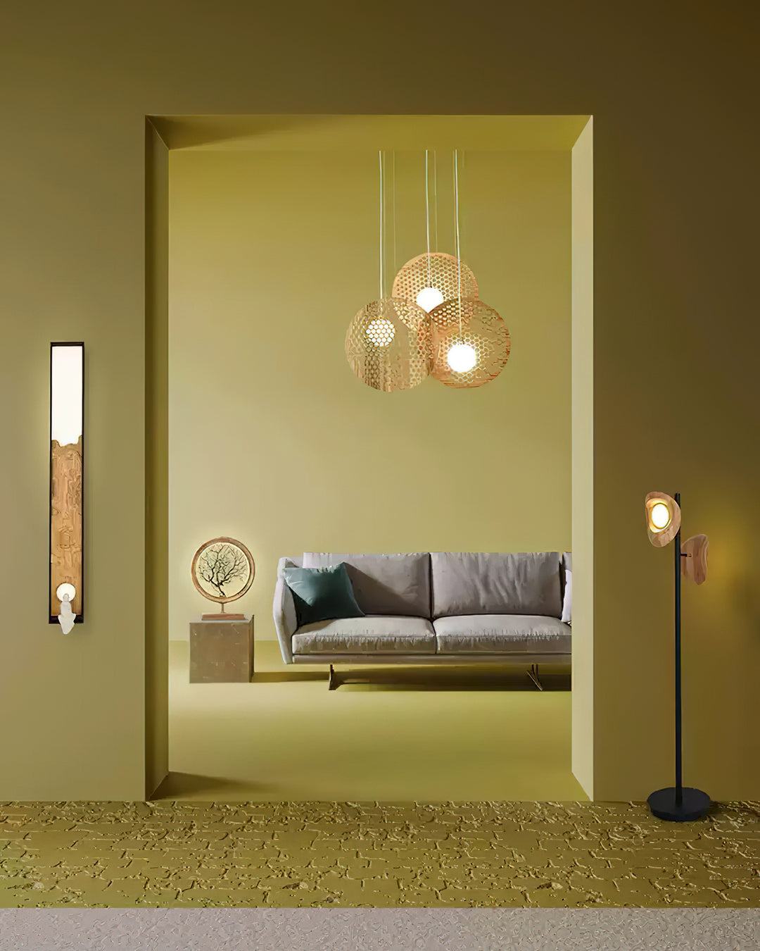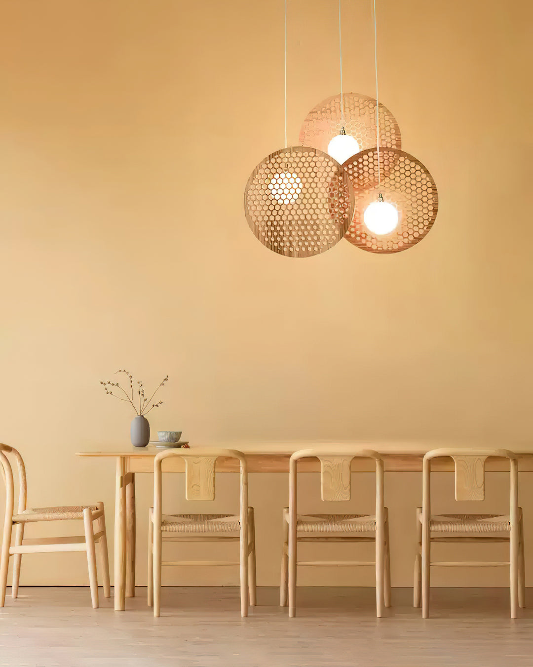 The Bee Plate Chandelier is a unique and artistic lighting fixture that perfectly blends geometric patterns with natural warmth. Inspired by the intricate structure of a beehive, this chandelier features large circular wooden plates that are perforated to allow light to filter through in fascinating patterns. Acrylic spheres behind these plates emit a soft, ambient glow, creating a stunning interplay of light and shadow.