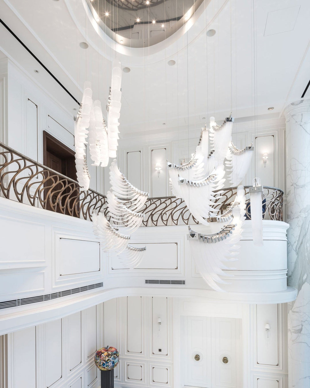 Get inspired by studying the movement of birds. Each gentle wing is constructed from a combination of 12 pieces of hand-blown clear and sandblasted glass. Twelve glass components are fixed in a manner that depicts the layered feathers on a bird’s wings. The grooved texture mimics the texture of feathers.