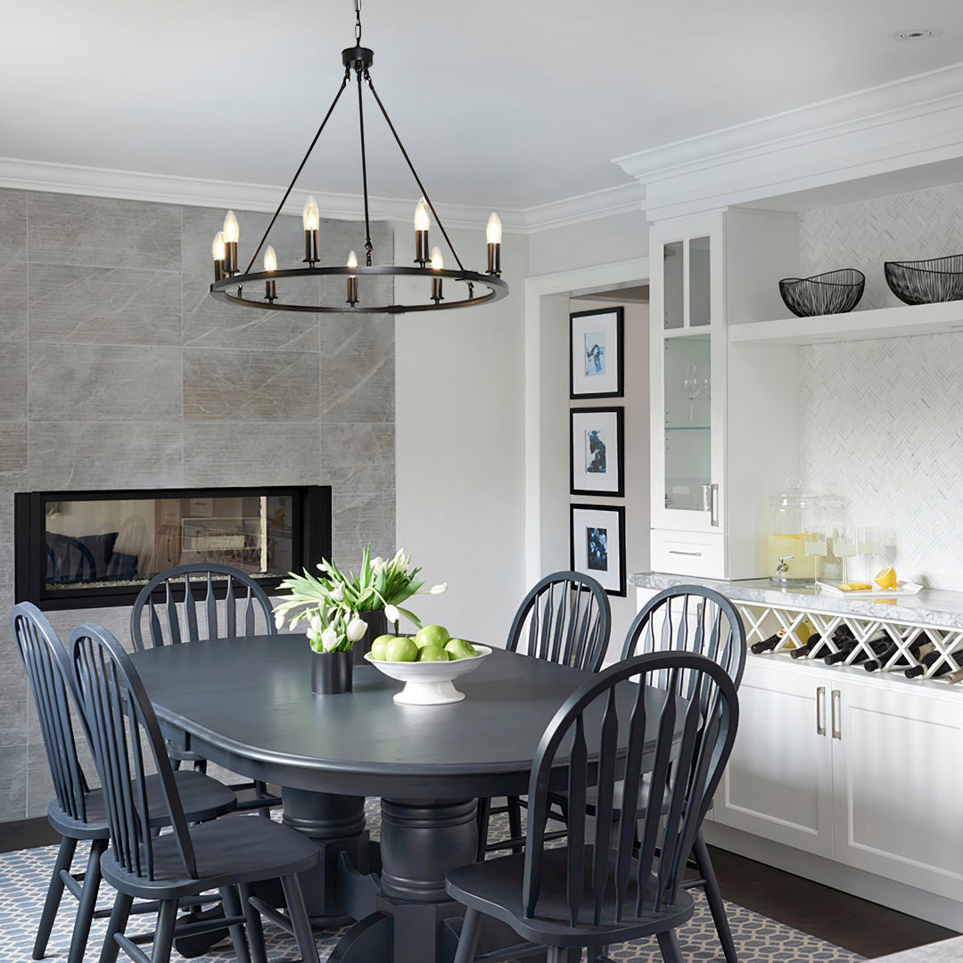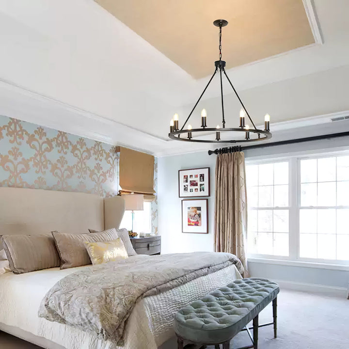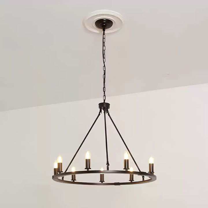 Transform your space with our Black Candles Ring Chandelier. The rustic, industrial design features a sleek black finish and exposed bulbs, creating a bold yet understated focal point. The open frame design and adjustable hanging chain make it perfect for any room, adding ample ambient light. Elevate your decor to new heights.