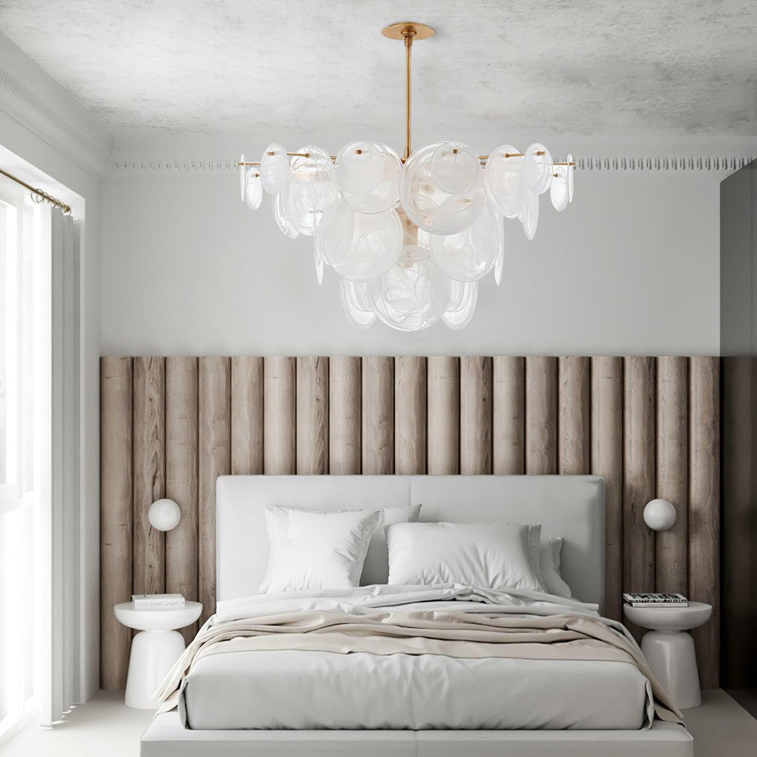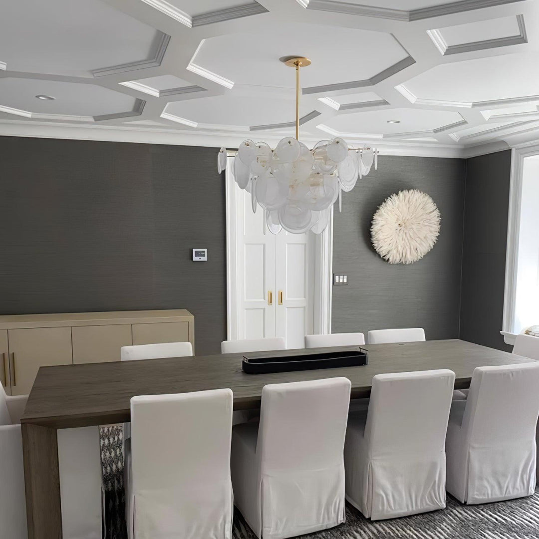 This elegant and eye-catching cascading chandelier is crafted with beautiful brass discs and white striped glass, combining Old-World charm with a modern twist. Perfect for any living room or dining space, this stunning statement piece will instantly bring a touch of elegance to your home. The large-scaled design of this chandelier will make a captivating impression, no matter where it is placed. Let the sleek lines and delicate shimmer of this chandelier bring a unique sparkle to your home.