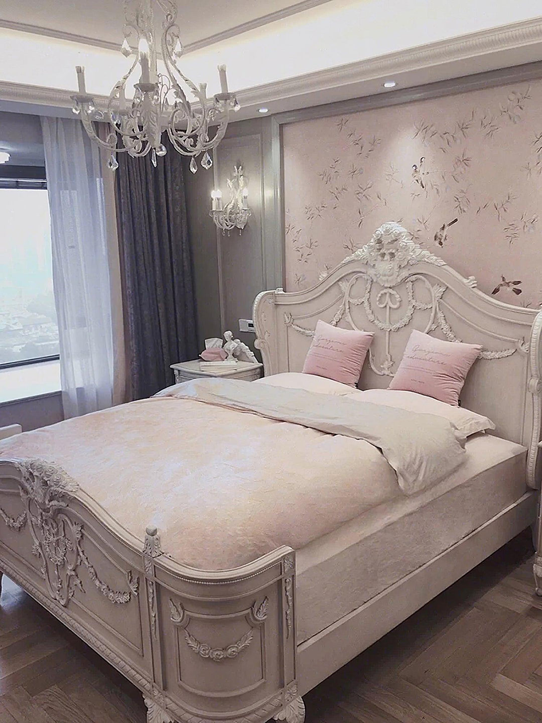 With a mix of scrolling arms, glittering crystal beads and delicate botanical accents, our chandelier exhibits equal amounts of genteel sweetness and unabashed grandeur.