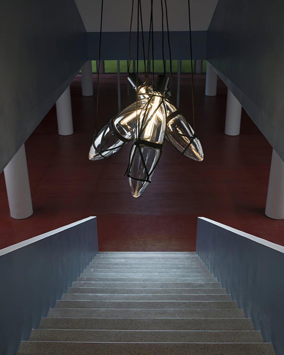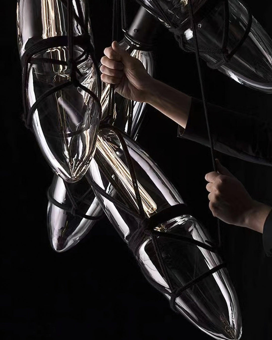 The Castaway Bottle Glass Pendant captures the spirit of a message in a bottle, set adrift on the sea and carrying tales of distant lands. This unique lighting piece features mouth-blown glass shades, each fashioned to resemble a bottle that has weathered the tides of time, complete with the delicate imperfections and bubbles of artisanal glasswork. The shades hang from an entwined array of nylon threads, reminiscent of the ropes and nets that might cradle such a find on the ocean’s surface.