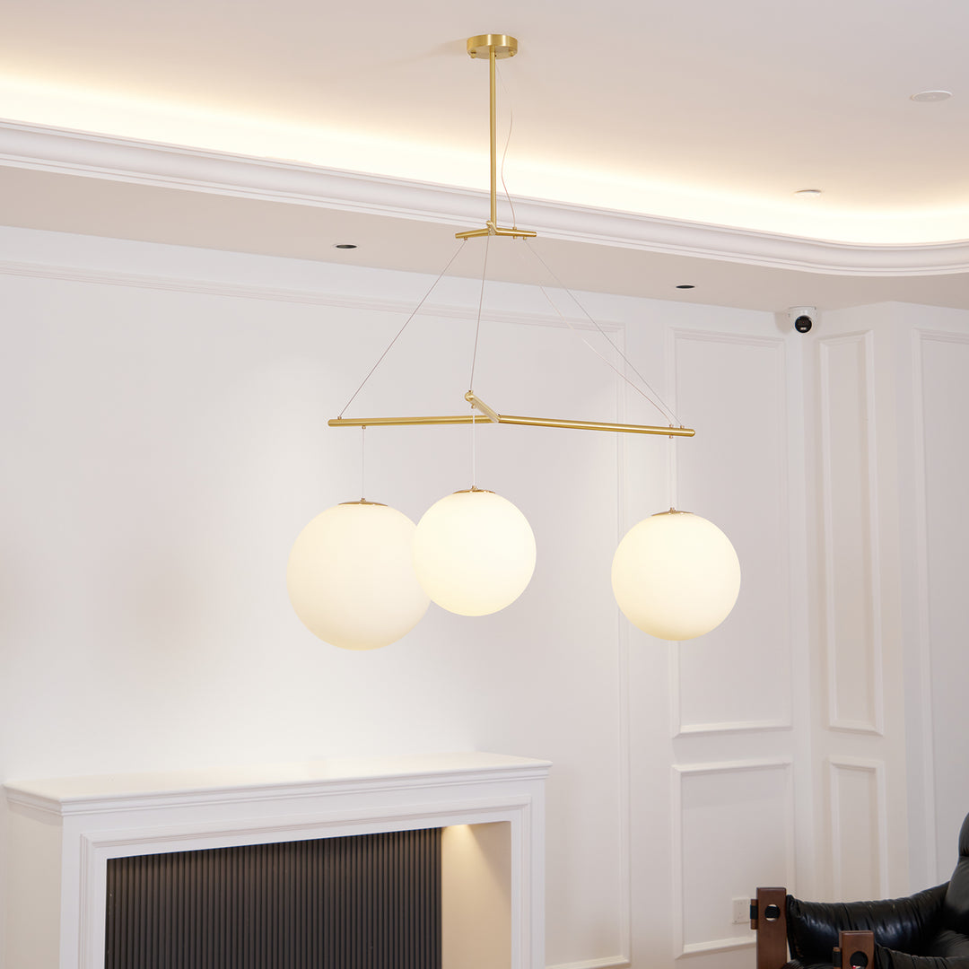 The construction of high-quality metal paired with the timeless elegance of glass shades makes this pendant not only a source of light but a centerpiece of modern design. Whether it’s poised above a dining room table or making a statement in a lofty entrance hall, the Celestial Orb Trio Pendant is designed to inspire and enchant. This lighting piece is a testament to minimalist beauty, where form and function align to create an atmosphere of sophistication and serenity.