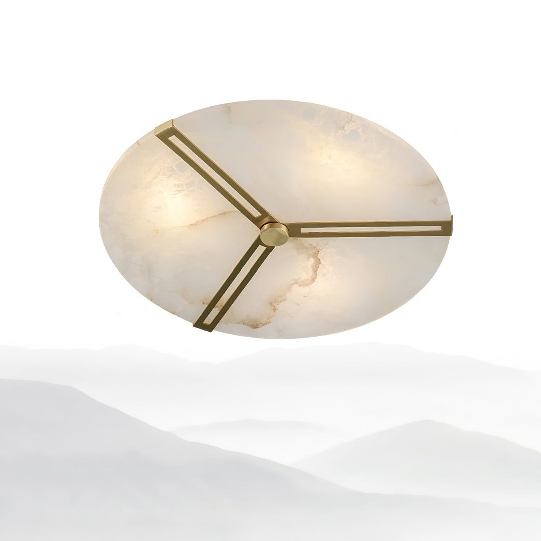 The Clocks Alabaster Ceiling Light blends sculptural elegance with time-inspired design. Featuring a circular alabaster face reminiscent of a classic clock, this ceiling light showcases natural veining unique to each piece. Brass-finished accents, styled like clock hands, radiate outward to create a minimalist yet artistic silhouette. Perfect for modern interiors, this fixture casts a warm, diffused glow, making it ideal for living rooms, bedrooms, and hallways seeking a refined decorative touch.