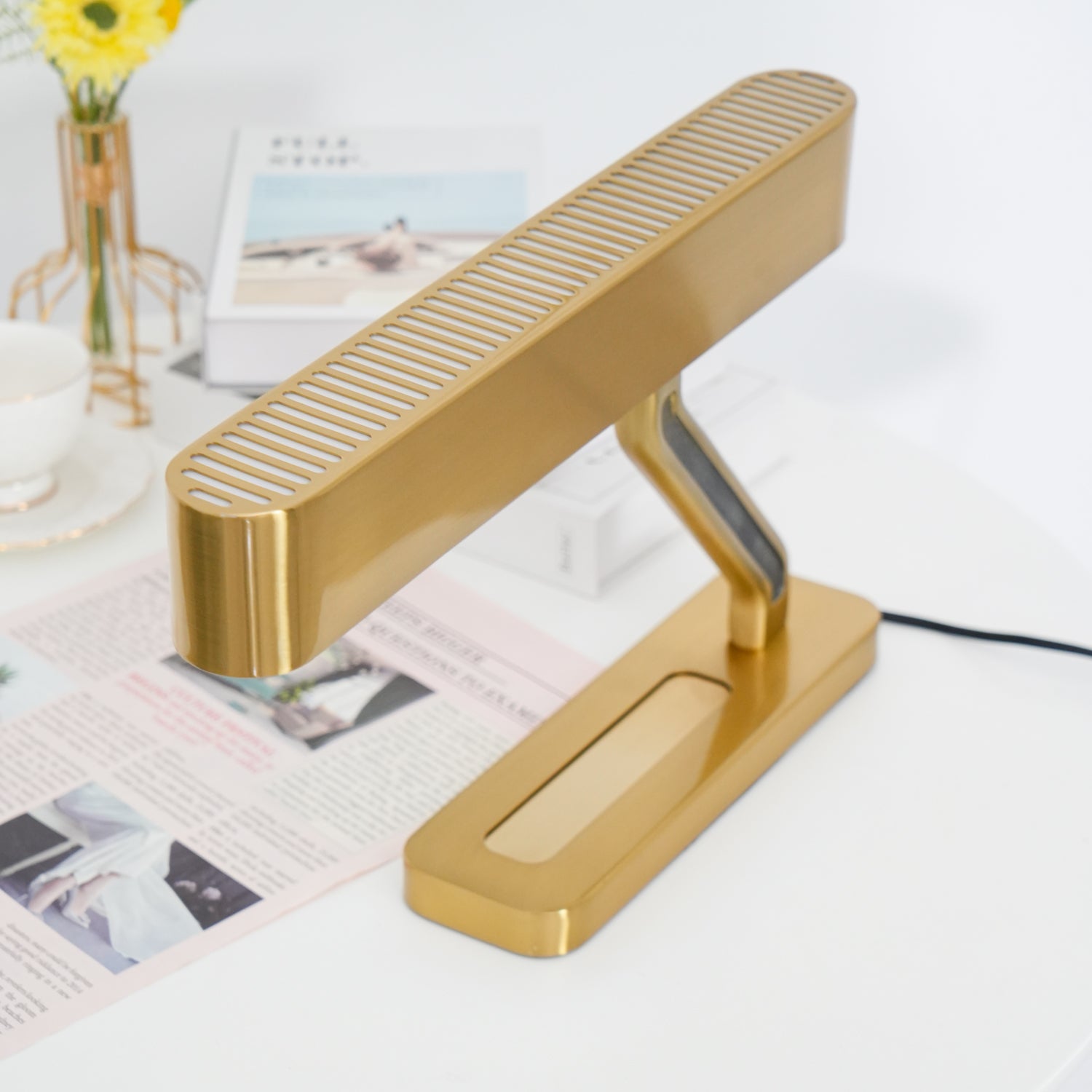 A machined brass grill lends an industrial feel to the sleek Colt Table Light. Featuring bronze inserts on the arm and opal diffusers for a soft, warm light, an inbuilt pen tray highlights we signature attention to detail.