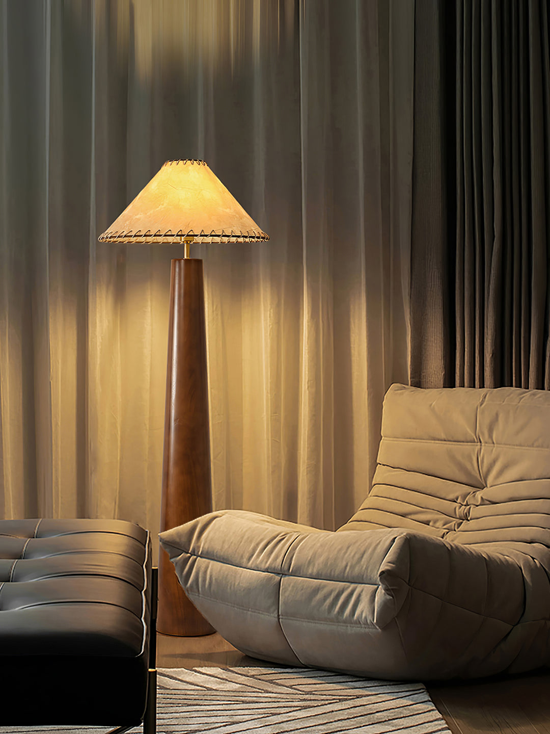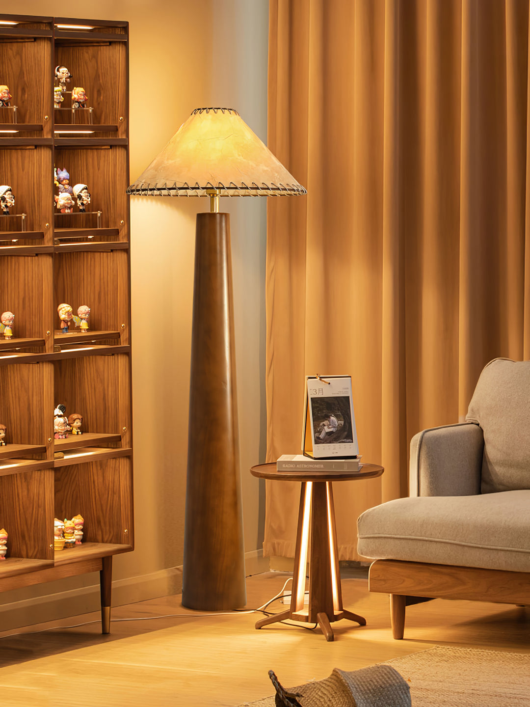 Above the wooden elegance rises the lamp’s highlight—a handmade paper shade. Delicately crafted, the shade diffuses light into a soft, ambient glow that can turn any room into a haven of relaxation. Its texture and craftsmanship draw inspiration from traditional artistry, bringing an artisanal touch to modern interiors.