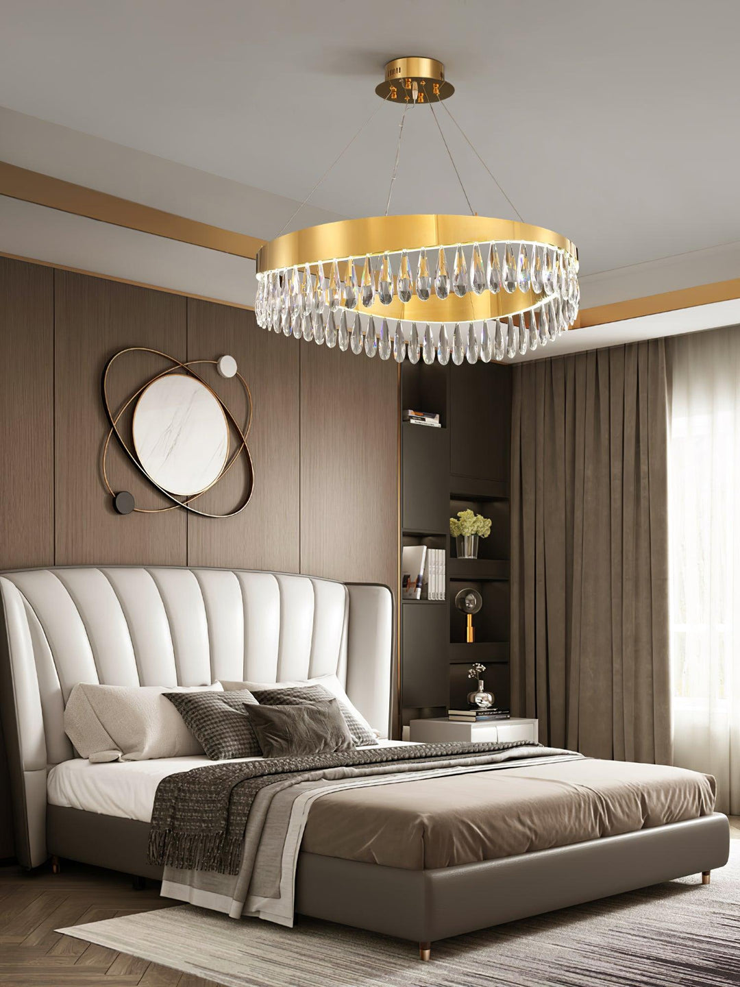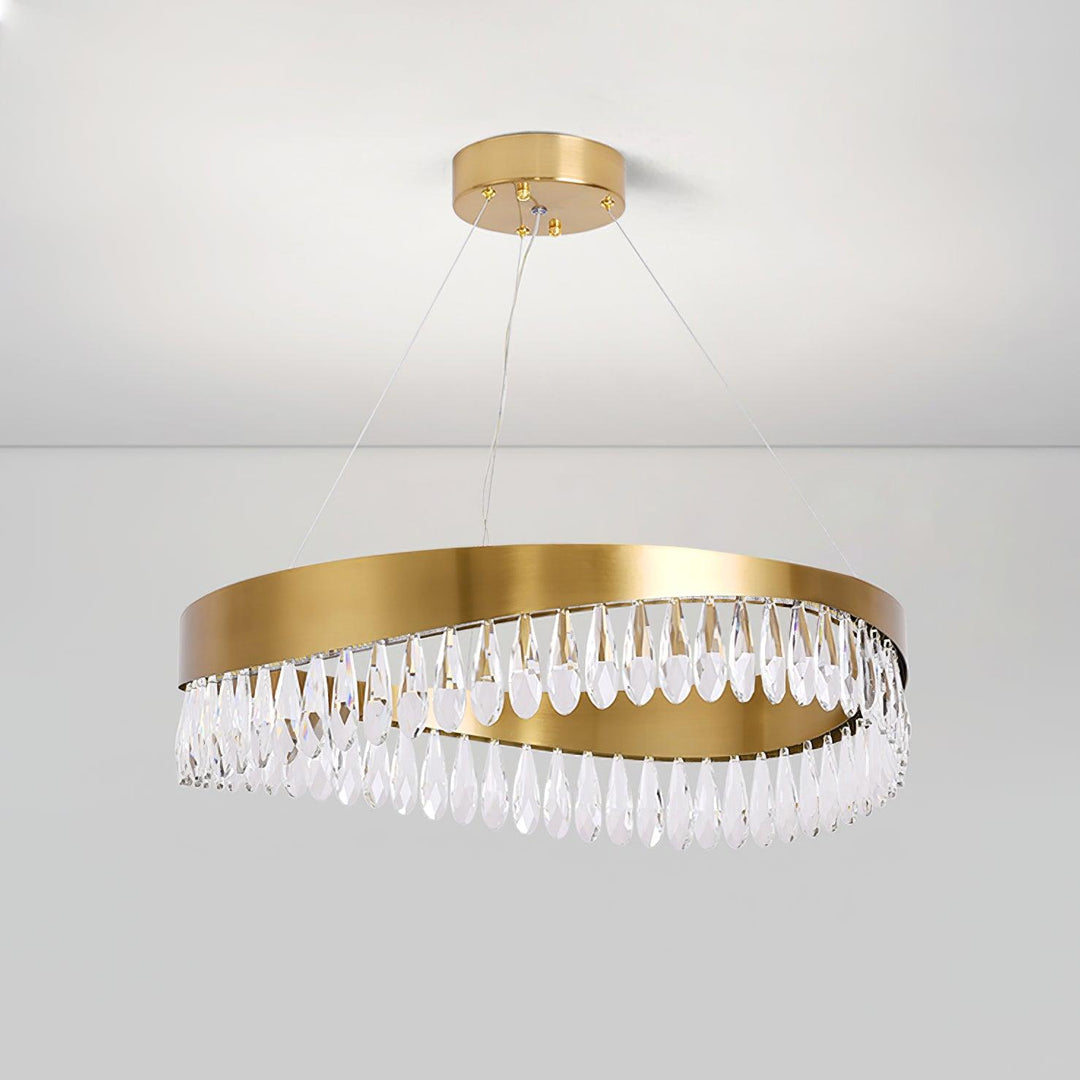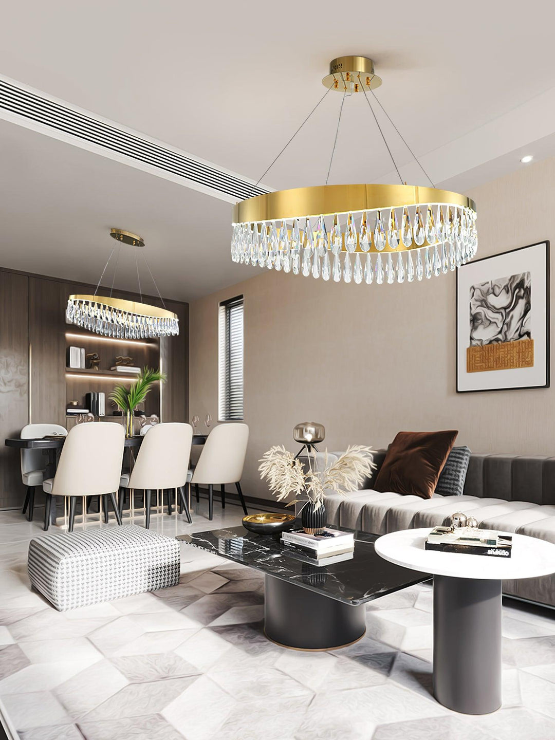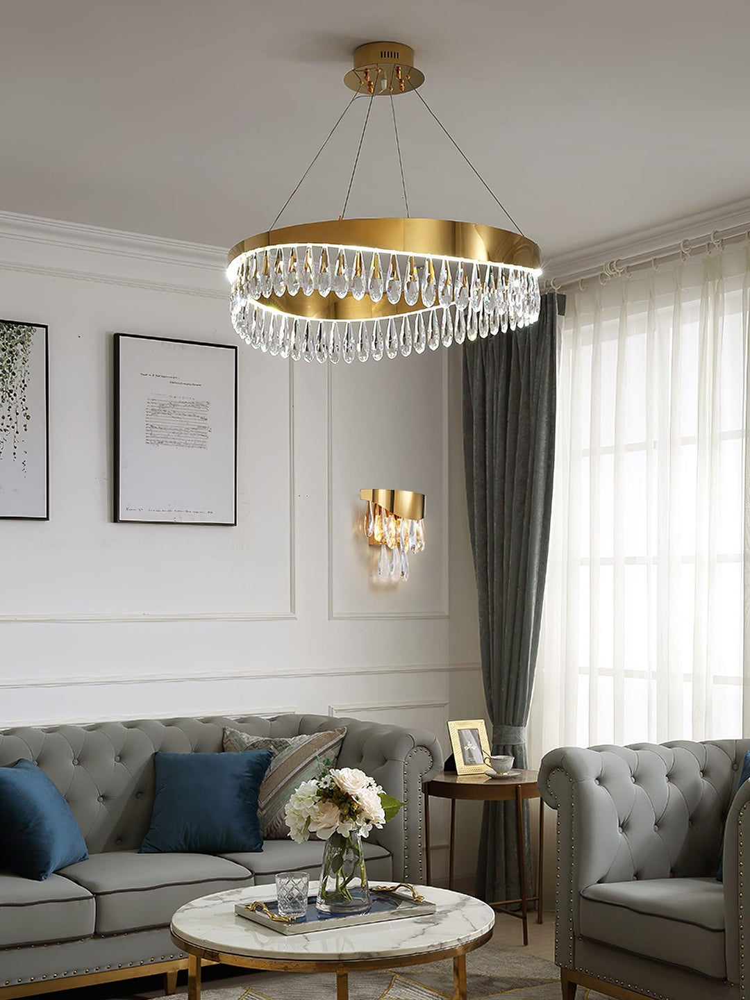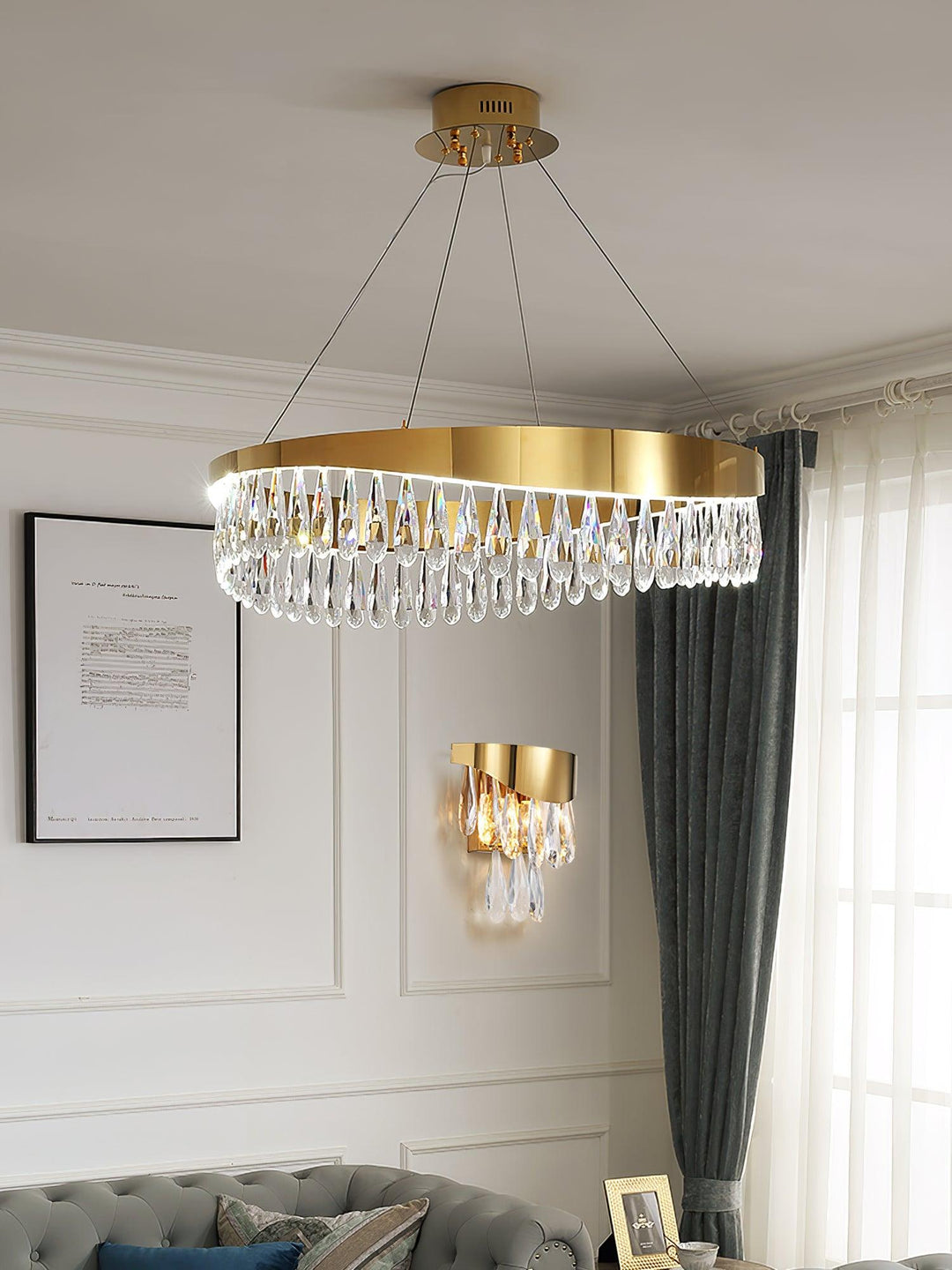 This exquisite LED chandelier is in a copper finish. The frame is made out of stainless steel in a round shape, and it comes with clear crystal accents. The LED bulb is integrated into the frame. The adjustable cord links make this fixture suitable for most ceiling heights.