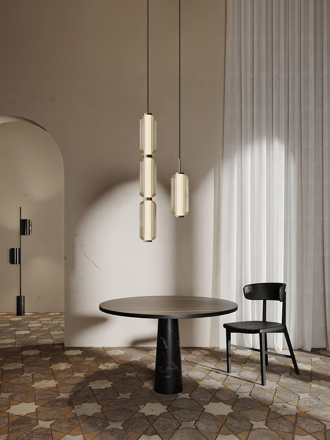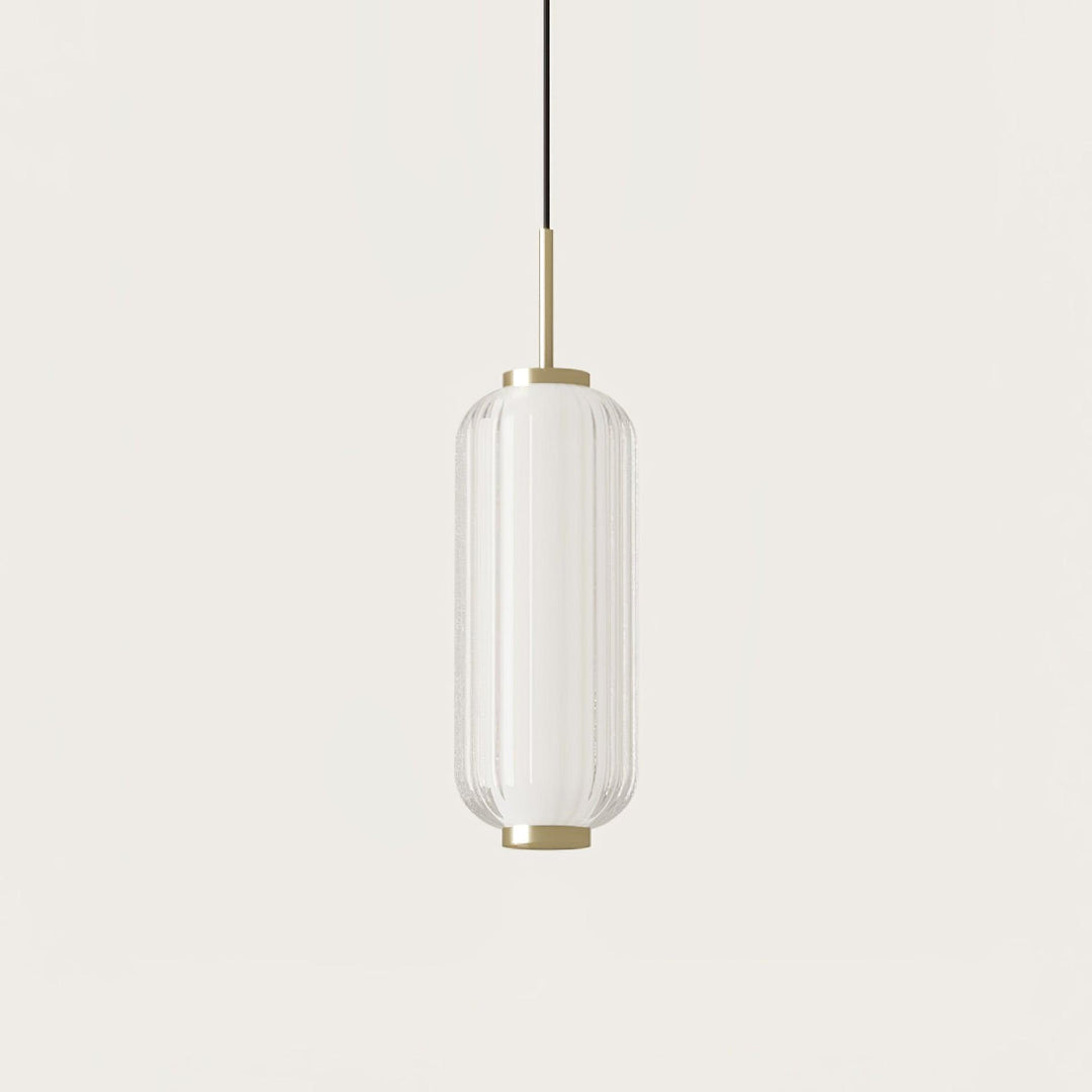 The Elma Linear Pendant Lamp is a sophisticated choice for illuminating any space. Its transparent striped glass cylinder has an airy quality and is anchored by a simple metal fixing at the top and bottom for a perfectly balanced contrast between materials. Create subtle, ambient lighting in any room with Elma.