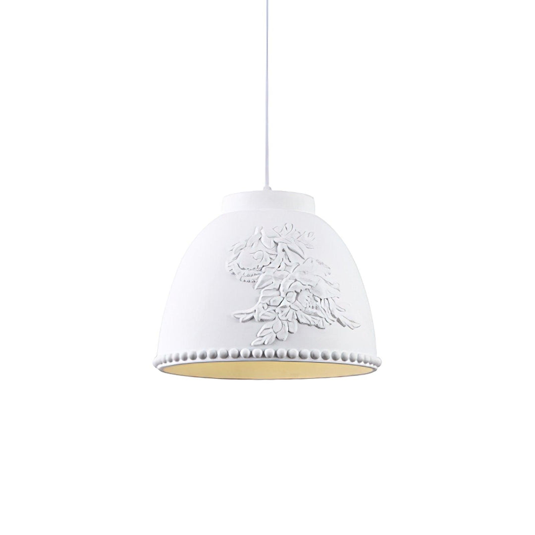 The dome-shaped shade, crafted from high-quality resin, features an intricately embossed floral pattern that evokes the delicate touch of a craftsman’s hand. The stark white finish brings out the depth and texture of the foliage-inspired design, allowing for a striking interplay of light and shadow when illuminated.