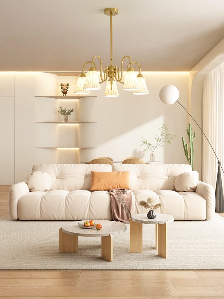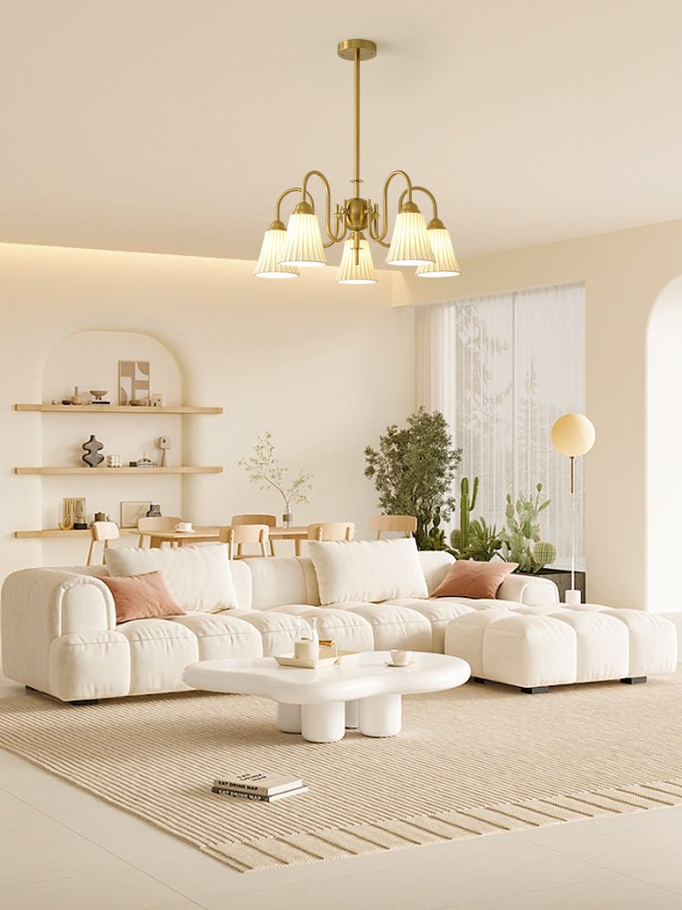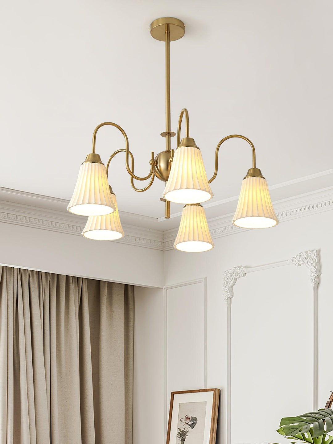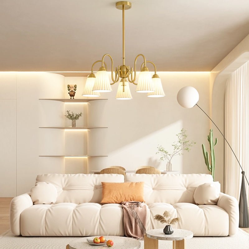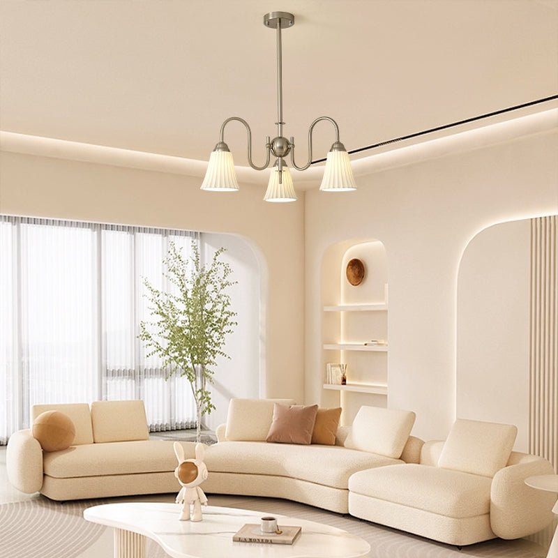 Intricately pleated shade lamps meet a simple frame in the Esther Chandelier. The white Ceramic for soft illumination in your space, in a balanced configuration. A straightforward structure made from iron brings a beautiful modern element to a traditional lighting fixture.