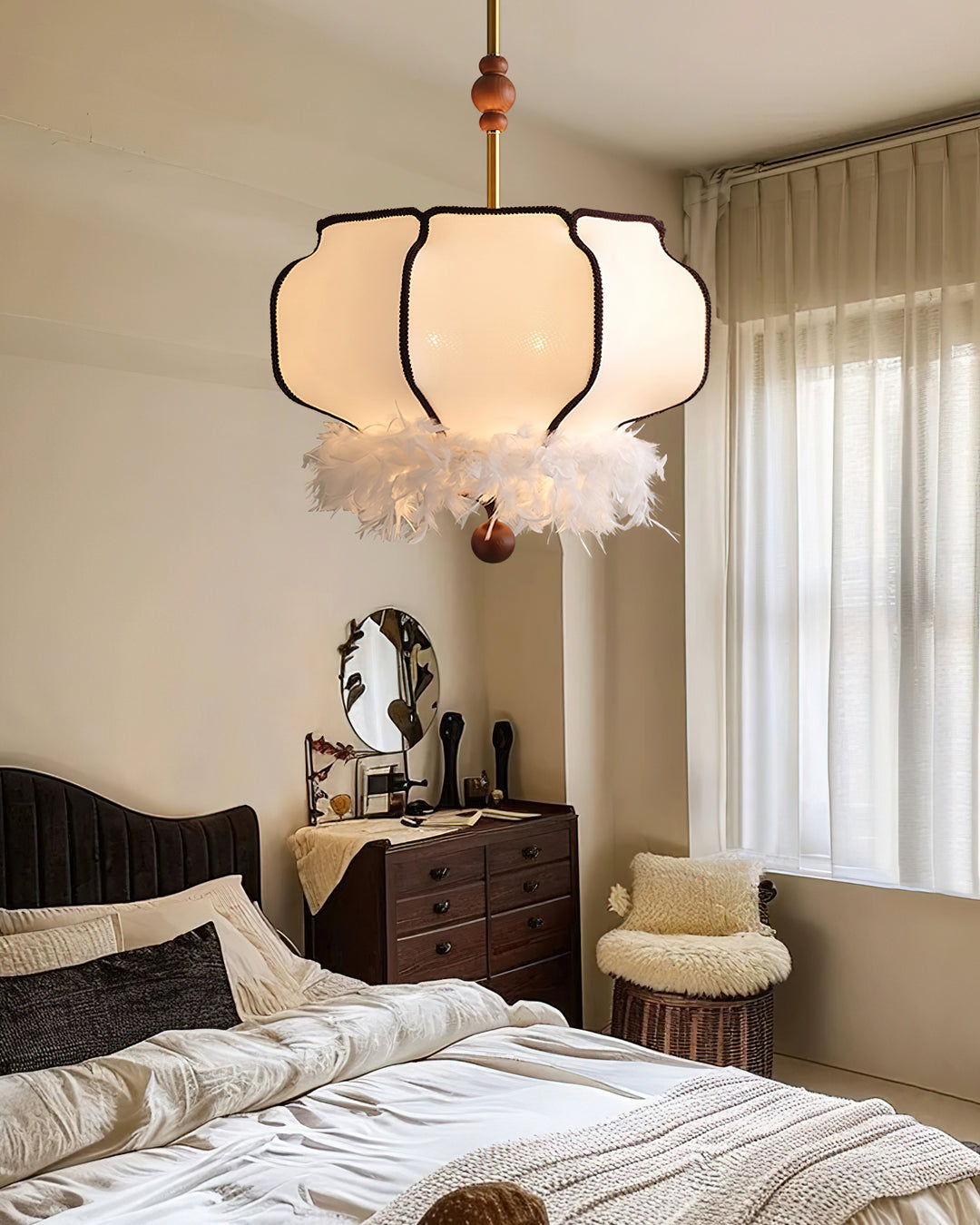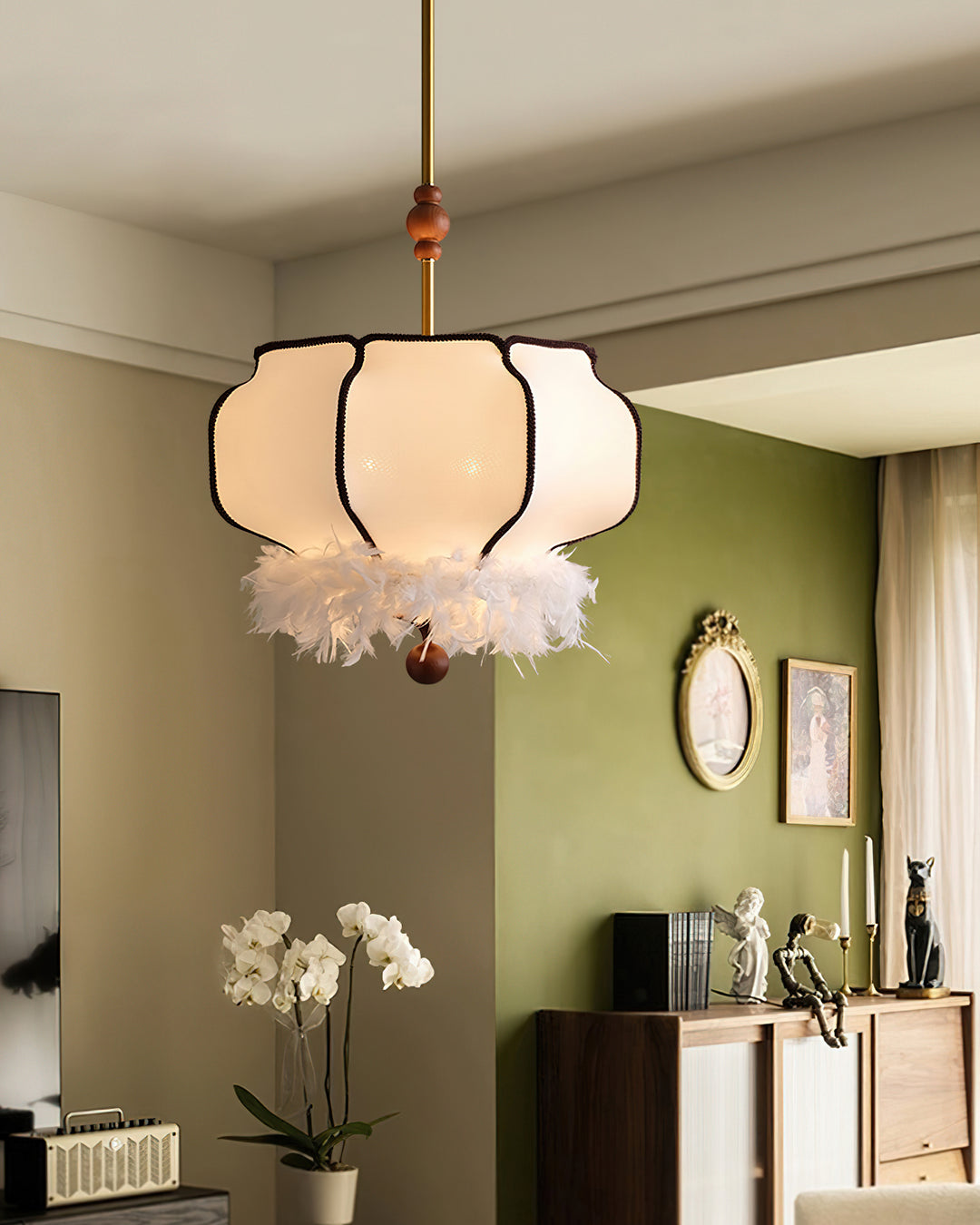 The Feathered Lantern Pendant Light boasts elegant curves and delicate feathers that add a touch of playful glamour to any room. Its natural design brings sophistication and brightness to your living space. Experience the perfect blend of style and nature with this stunning chandelier.