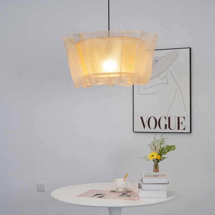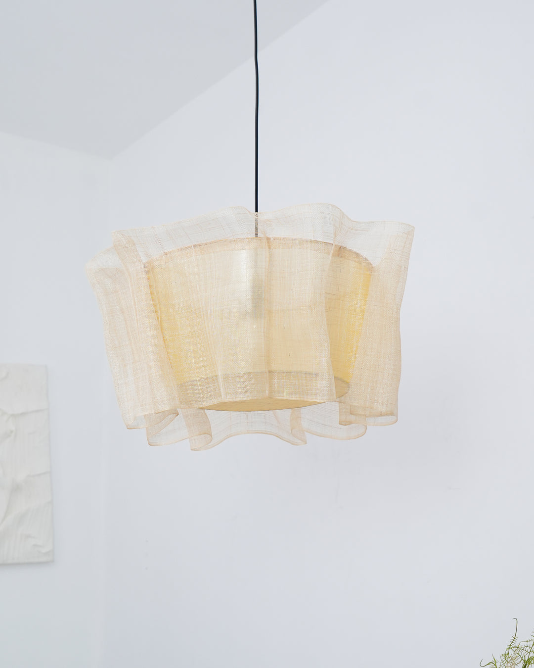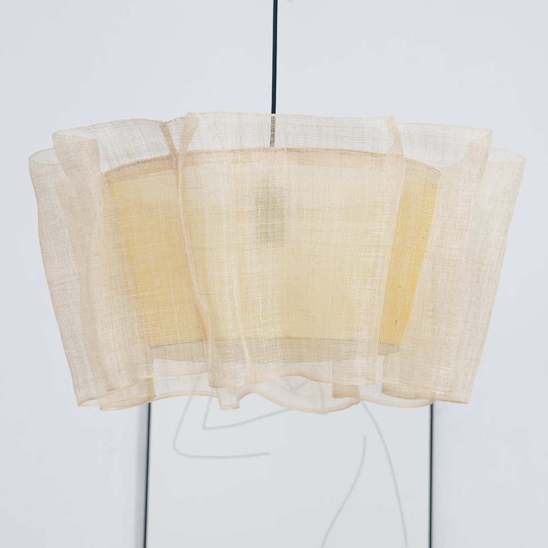 This elegant lighting fixture features a cluster of Manila hemp strips, each one a delicate banner of the finest flax, that falls in an organic, undulating pattern around the light source. The warm glow of the lamp is filtered through the breathable, textured Manila hemp, casting a soft, inviting light that plays off the subtle weave of the fabric. This pendant lamp is anchored by a minimalist metal support, which contrasts with the natural Manila hemp to create a balanced, modern aesthetic.