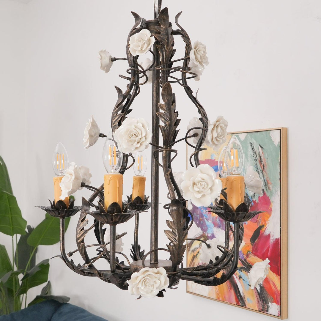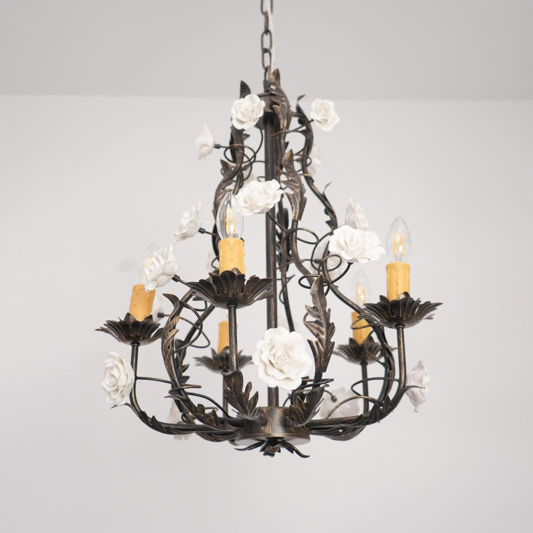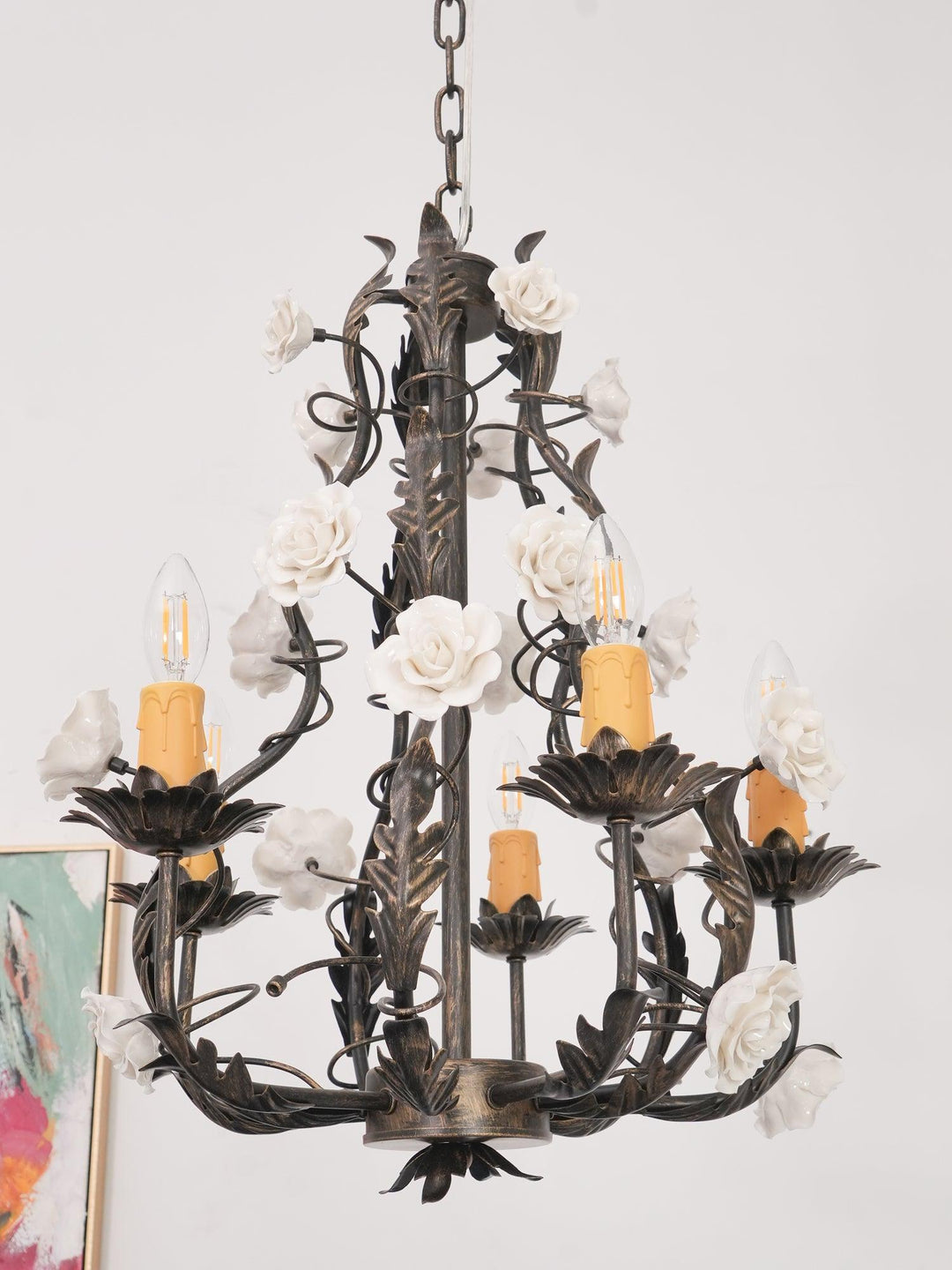 The dark metal structure forms an elegant base for the chandelier, with vines and leaves that spiral gracefully, supporting the ceramic roses in full bloom. Each rose is sculpted and painted by hand, emphasizing the individual beauty and unique character of every piece. The soft glow of the light bulbs, reminiscent of candlelight, complements the creamy white of the ceramic, casting a warm, inviting light that enhances the intricate details of the floral design.