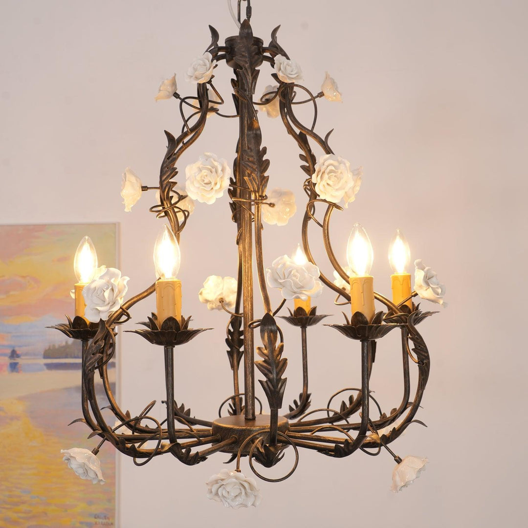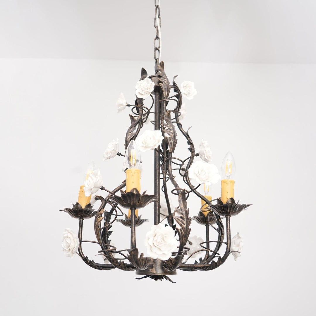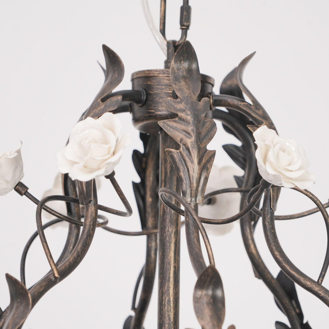 The dark metal structure forms an elegant base for the chandelier, with vines and leaves that spiral gracefully, supporting the ceramic roses in full bloom. Each rose is sculpted and painted by hand, emphasizing the individual beauty and unique character of every piece. The soft glow of the light bulbs, reminiscent of candlelight, complements the creamy white of the ceramic, casting a warm, inviting light that enhances the intricate details of the floral design.