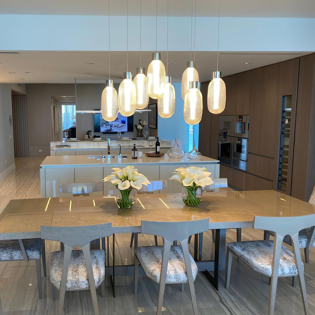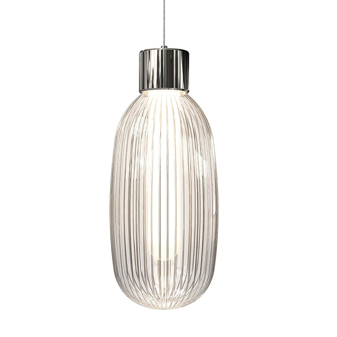A softly shaped volume, realized in clear ribbed glass, dramatically reveals a white luminous core within.