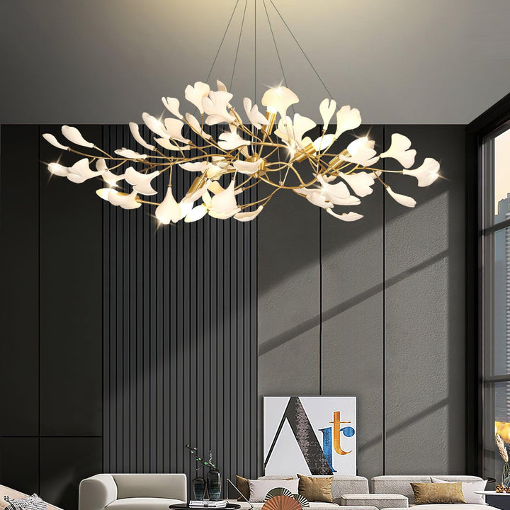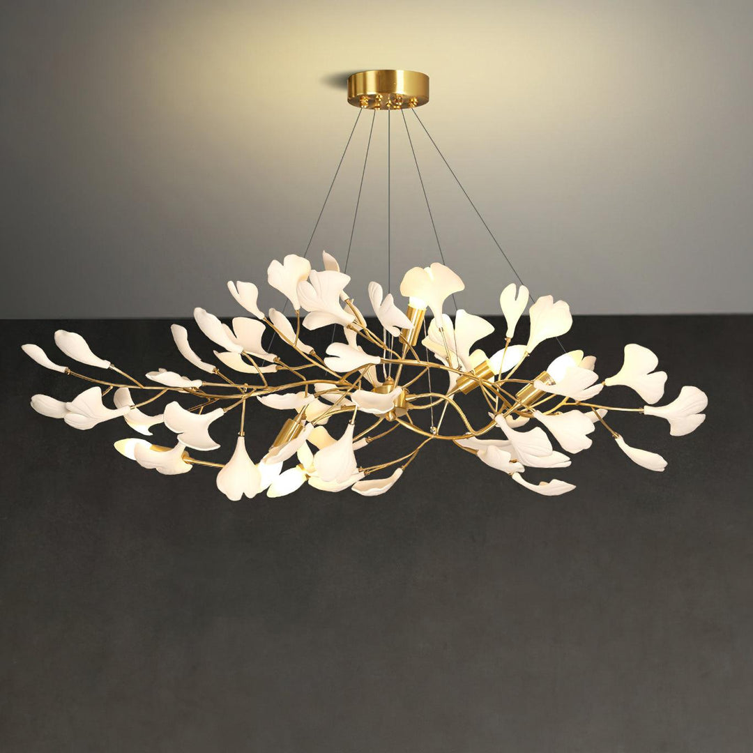 This ginkgo leaf chandelier is made of high-quality brass and ceramics. The golden color of brass adds a touch of classic luxury to the chandelier, and is perfectly combined with the exquisite ceramic ginkgo leaves on it, showing a modern yet classic beauty. The brackets made of brass ensure the sturdiness and durability of the chandelier, while the ceramic ginkgo leaves shine under the light, emitting a tranquil and soft luster, creating a warm and elegant atmosphere for the indoor space. A perfect blend of modern craftsmanship and natural beauty, this chandelier will undoubtedly be the focal point of any space.
