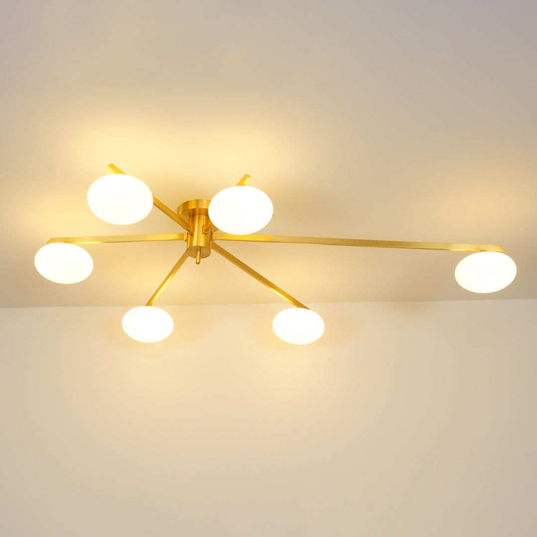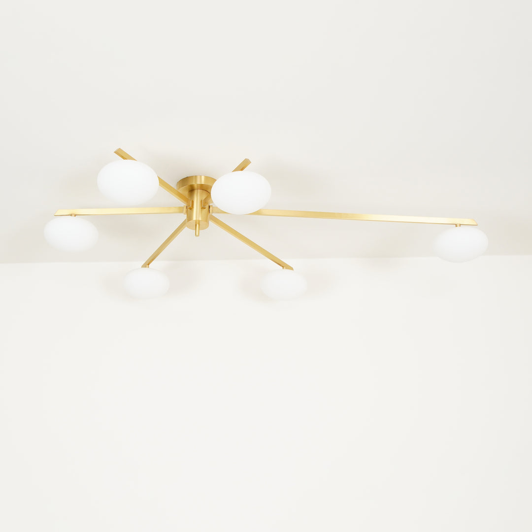 The Jasper Ceiling Lamp features a slender black arm with a white glass oval bulb, mounted atop a slim minimalist center body. Its low profile makes it perfect for lower ceiling heights. Brighten up any room with its modern design.