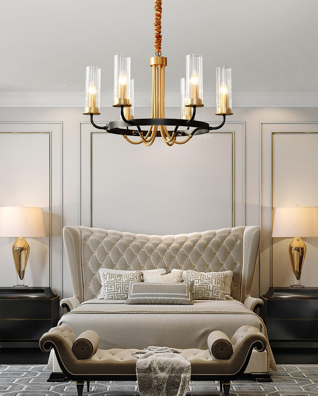 Beautifully constructed of vintage metal with warm brass accents, this chandelier is both on-trend and timeless. Its sleek lines, traditional design and tall, cylindrical glass covers don’t demand attention, yet draw it with a quiet sophistication that is always in style.