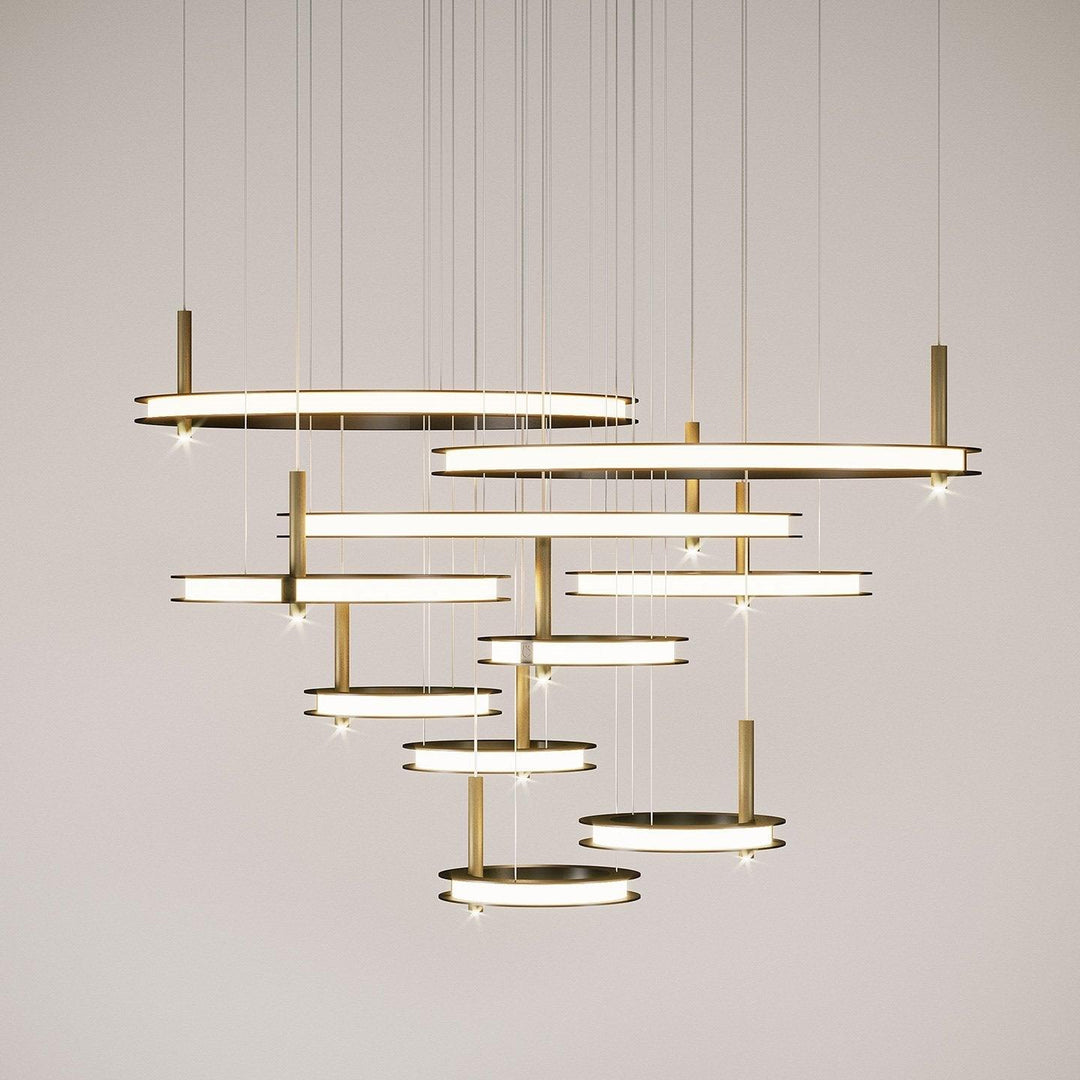 A new graphic alphabet consisting of essential geometric elements that create contemporary light forms in the space. Three rings in different diameters can be installed separately or as composition. The metal ring is in satin black finish, with light diffuser in white acrylic along the perimeter. Each ring carries a LED spot in mat gold finish. Each ring has three suspension cables, one of which is a power supply one.
