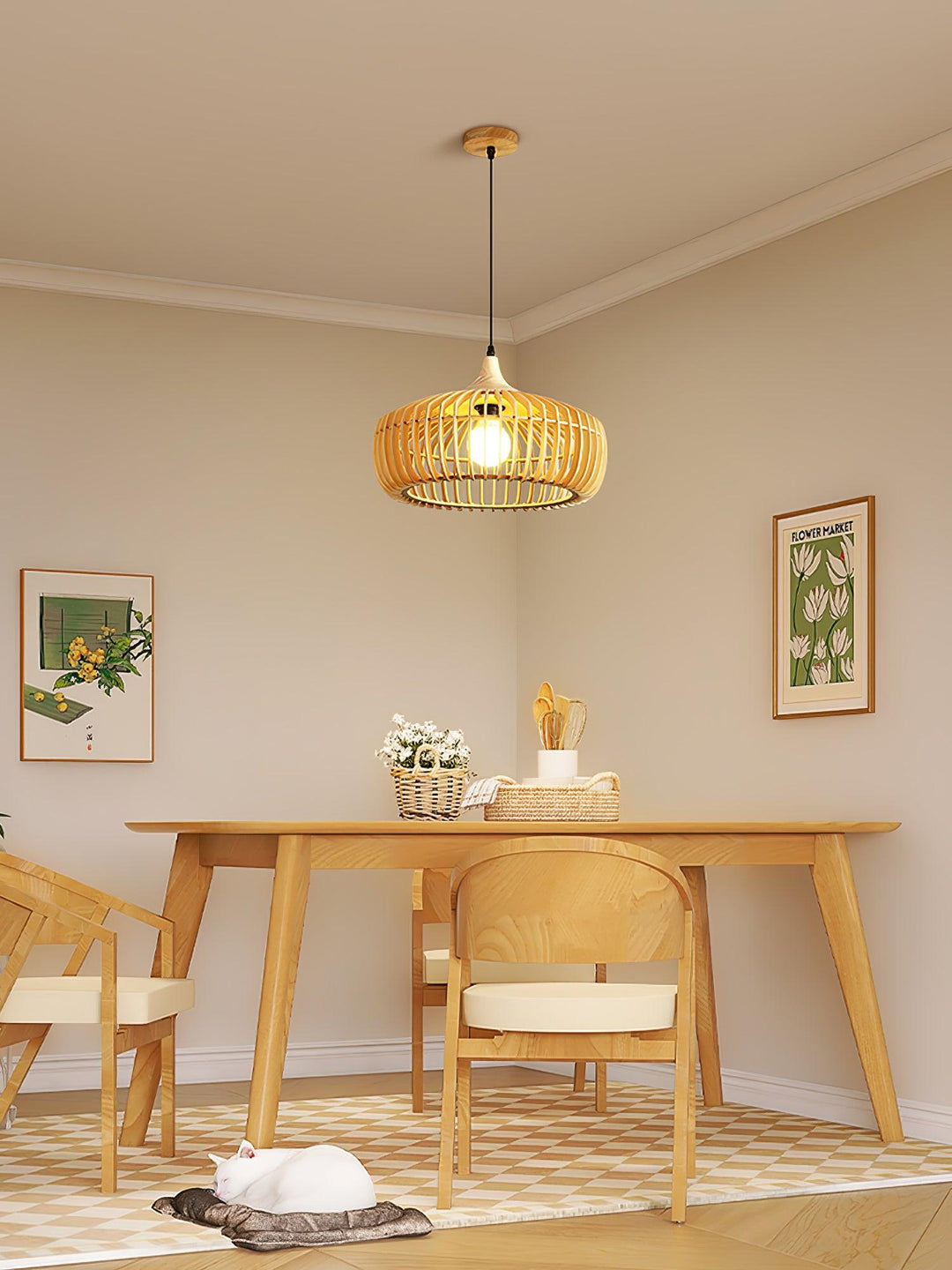 The metal components of the pendant provide a sleek contrast, their clean lines and refined finish offering a contemporary twist to the rustic shade. When lit, the bulb’s glow is softly diffused by the wooden cage, casting a warm, inviting ambiance throughout your space. Ideal for creating a focal point in living rooms, dining areas, or entryways, the Lattice Nest Wooden Pendant is more than a lighting fixture—it’s a statement of design that draws inspiration from the natural world and transforms it into an elegant piece for modern living.