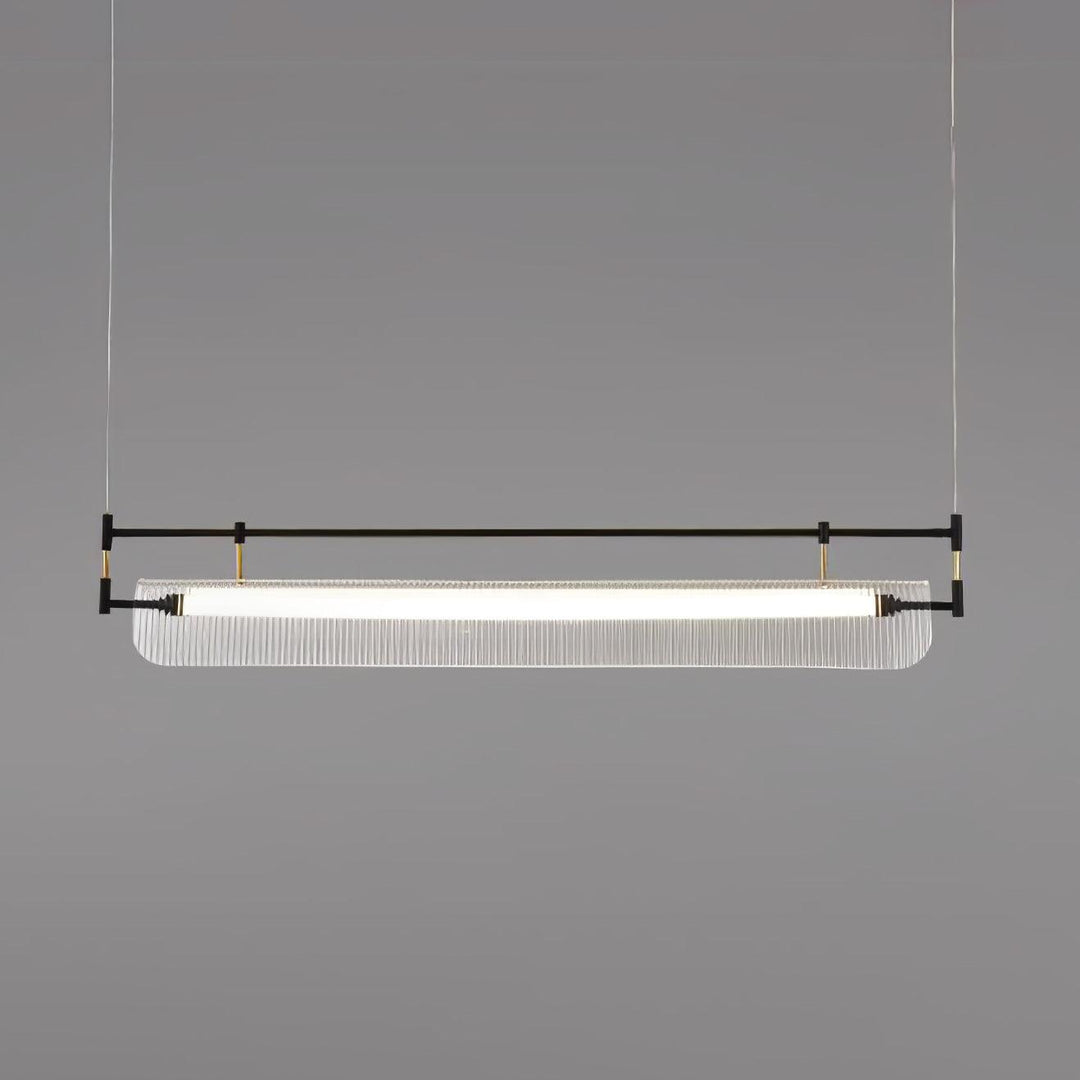 The Linear Strip Chandelier is a unique combination of metal and acrylic with bold yet lightweight design. The metal frame creates an eye-catching silhouette, while the acrylic arches soften its look. Its delicate, almost-disappearing lines create an elegant look, and the stripe pattern of the acrylic gives off a soft and spacious lit effect. This long-spanning light is perfect for dinner tables.