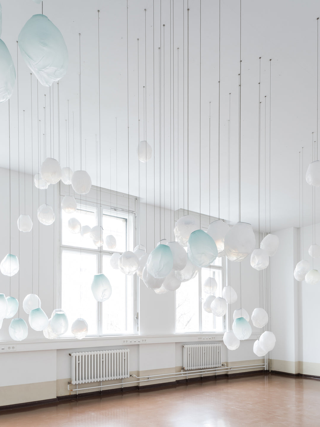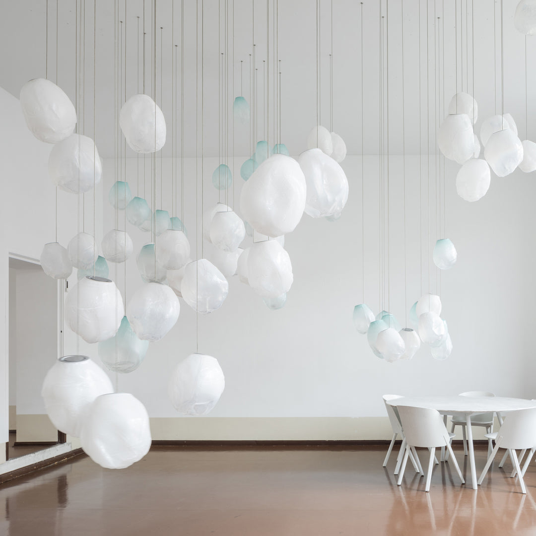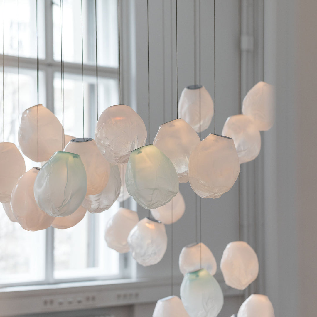 Liquid Glass Stone Pendant Light results from blowing liquid glass into a folded and highly heat-resistant ceramic fabric vessel. The resulting shape has a formal and textural expression intuitively associated with fabric, which becomes permanent and rigid as it cools. A flat LED is positioned to fill the resulting volume with diffuse light, accentuating the volumetric perception of the piece.