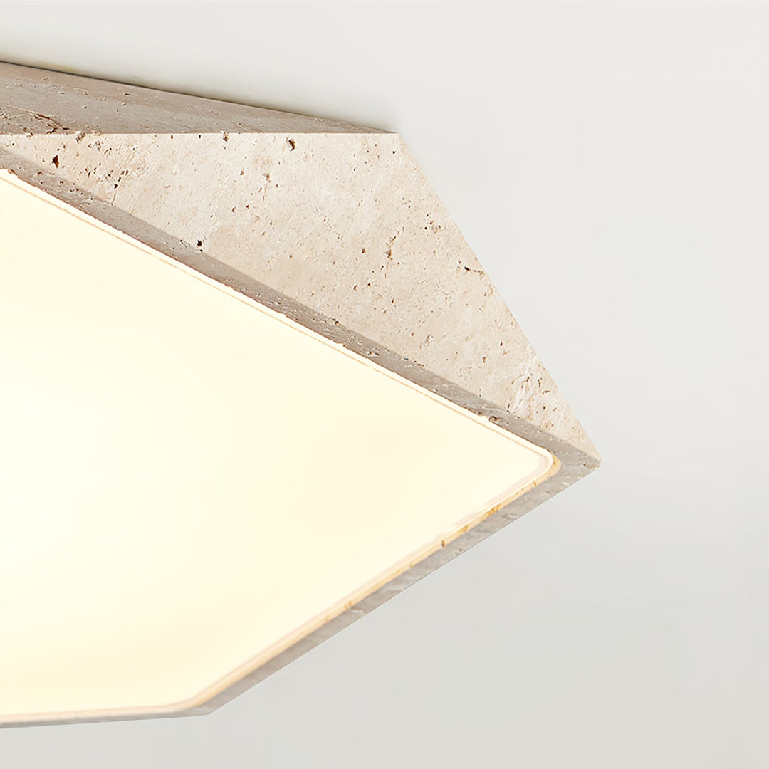 Inspired by the geometry of natural crystals and the softness of moonlight, the Lunarc Stone Flush Mount blends sculptural elegance with organic texture. Crafted with a faceted travertine stone frame and a softly diffused hexagonal glass panel, this ceiling light casts a warm, ambient glow ideal for modern interiors. Its low-profile design and unique silhouette make it both functional and striking, perfect for spaces seeking subtle luxury and architectural interest.