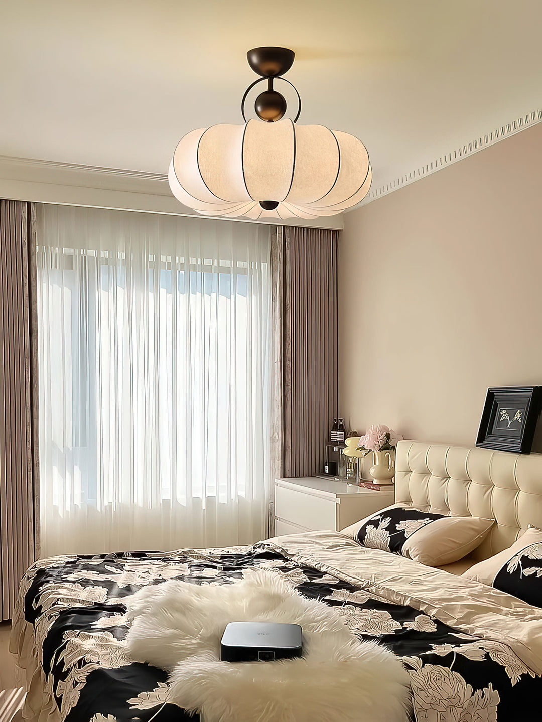 The Lunelle Cloud Ceiling Light captures the soft elegance of floating forms with its sculptural, cloud-like silhouette. Crafted with a delicately pleated Silk. shade, its organic curves resemble a blooming flower or a drifting lantern, offering a serene visual rhythm that transforms your ceiling into a statement of softness. The central bronze-toned structure adds a touch of vintage sophistication, balancing warmth and refinement. Perfect for bedrooms, entryways, or cozy living spaces, the Lunelle radiates a gentle, ambient glow that elevates the atmosphere with subtle drama and poetic charm.