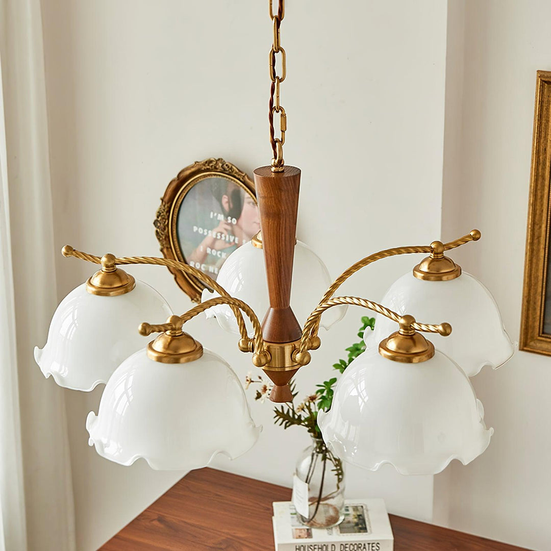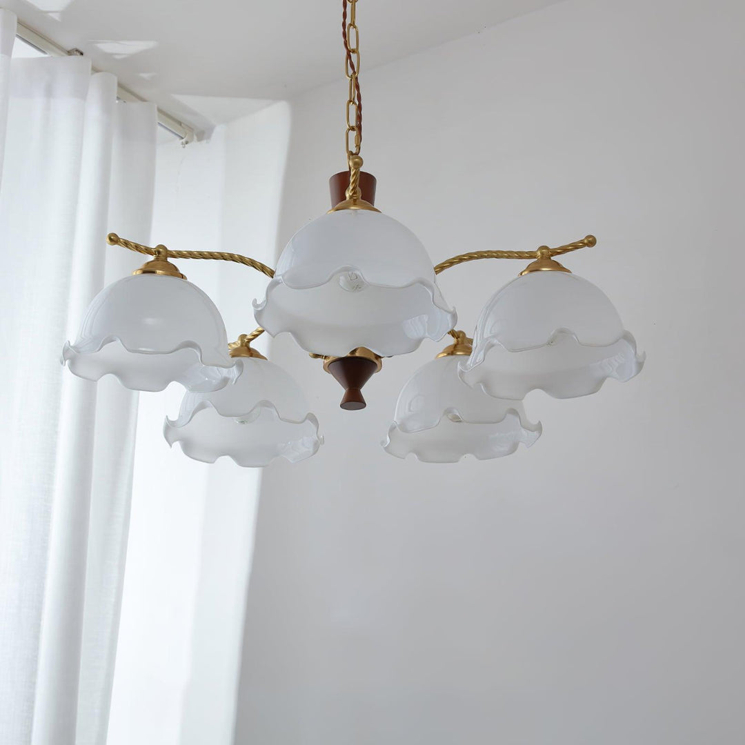 A modern update on the classic chandelier, this is an eye-catching lighting centerpiece sure to raise admiration. The chandelier features a striking flower lampshade. lamp body curving out downwards, this chandelier is a stylish choice for a living room or living space.