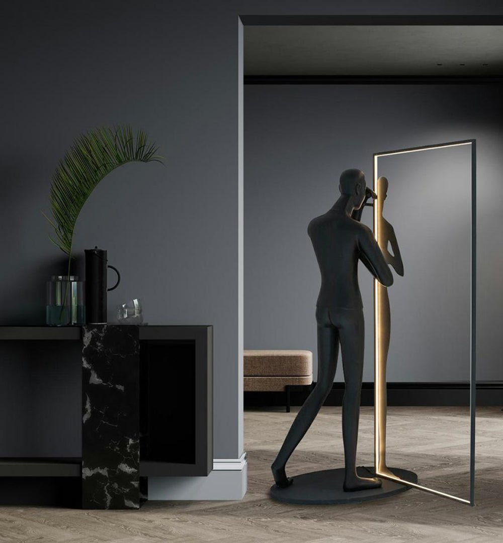 The Mirror Sculpture Floor Lamp is a striking design piece that merges art and lighting. Its modern figure gazes into a mirror, symbolizing introspection, while emitting a soft glow to illuminate its surroundings.