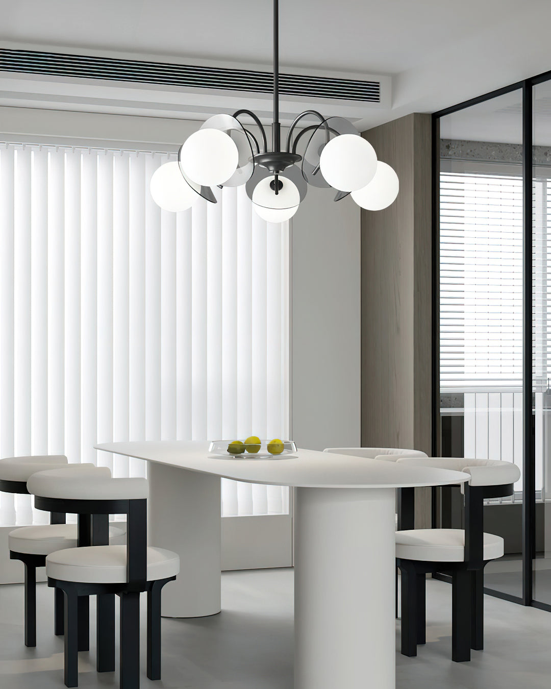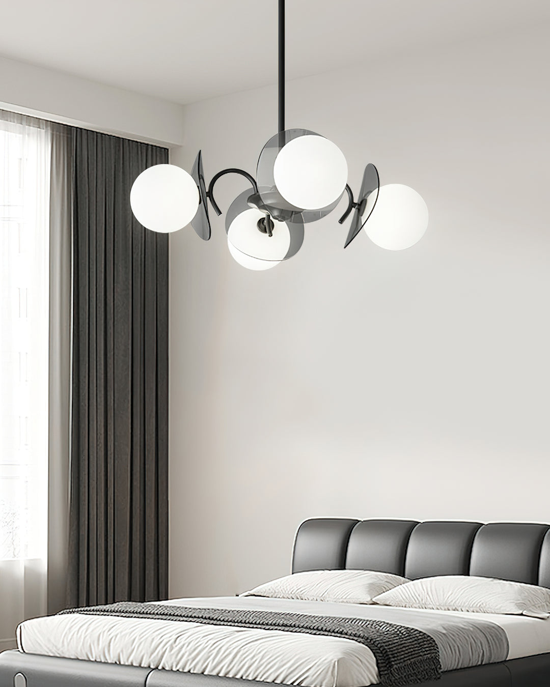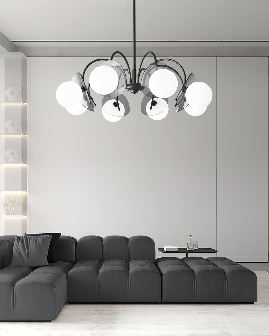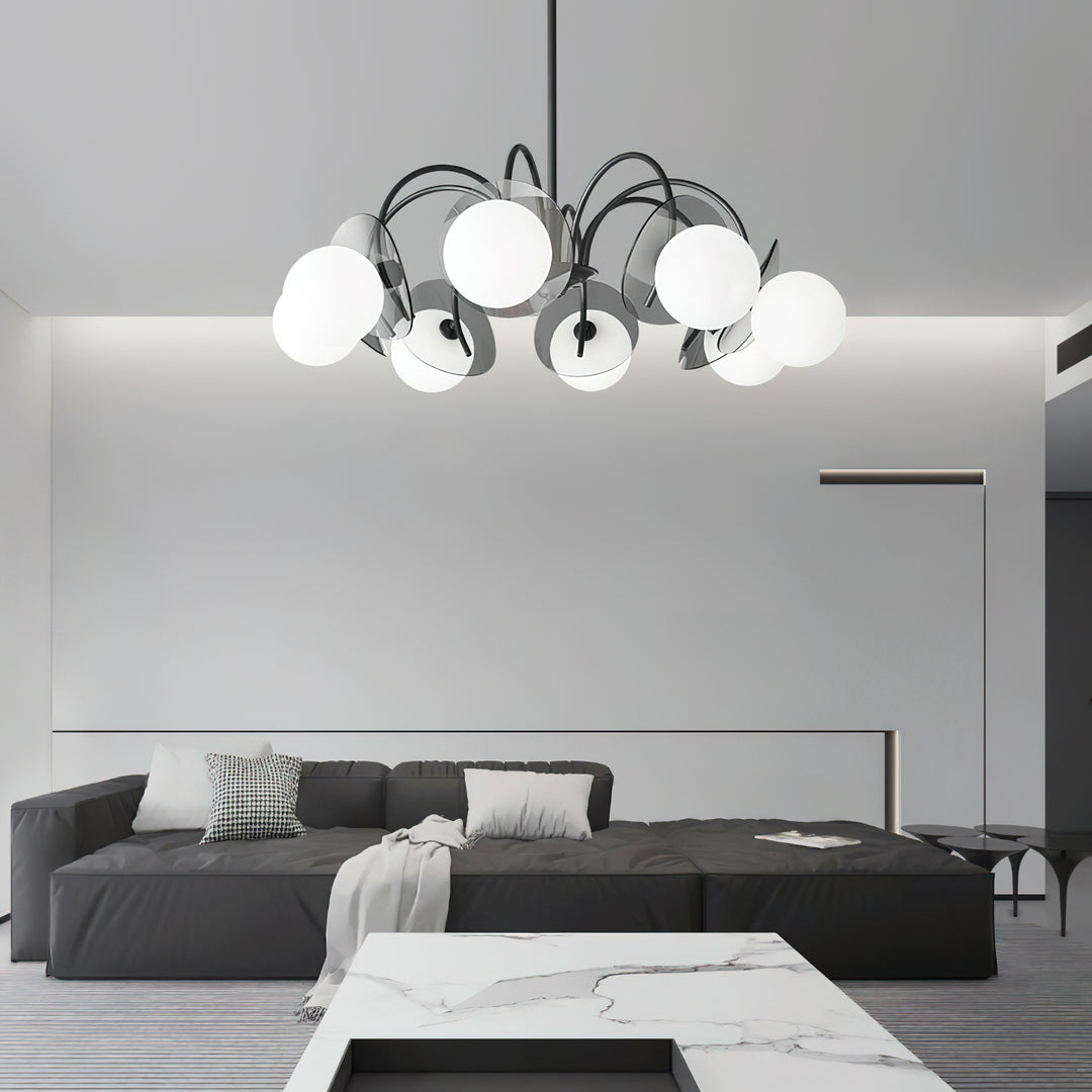 Transform any room into a modern and intriguing space with our Molecular Spherical Glass Chandelier. Featuring a sleek black frame and multiple glass spheres, it creates a visual effect akin to a solar eclipse. The interplay of light and shadow adds depth and charm, making it the perfect focal point for a living space, dining room, or entryway.