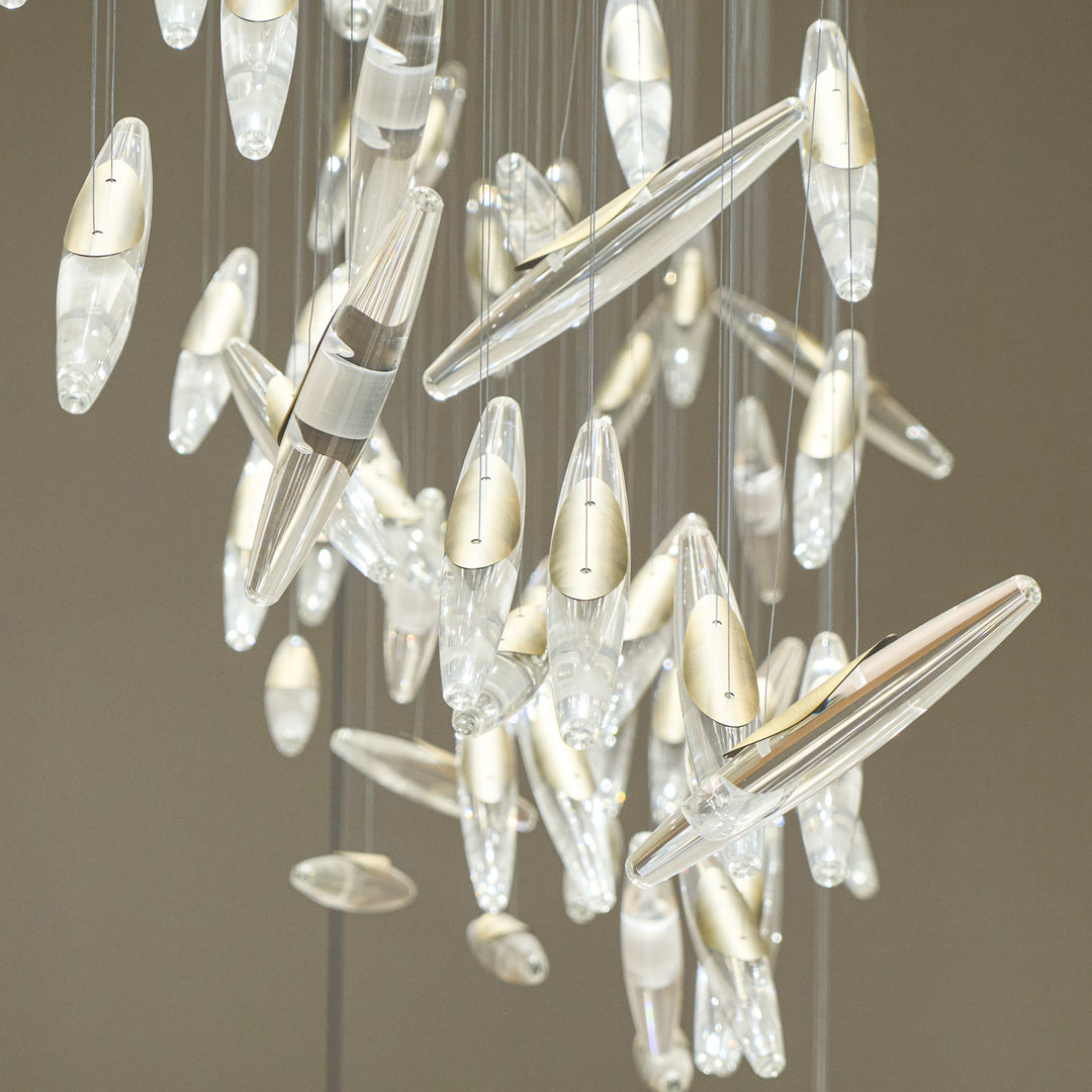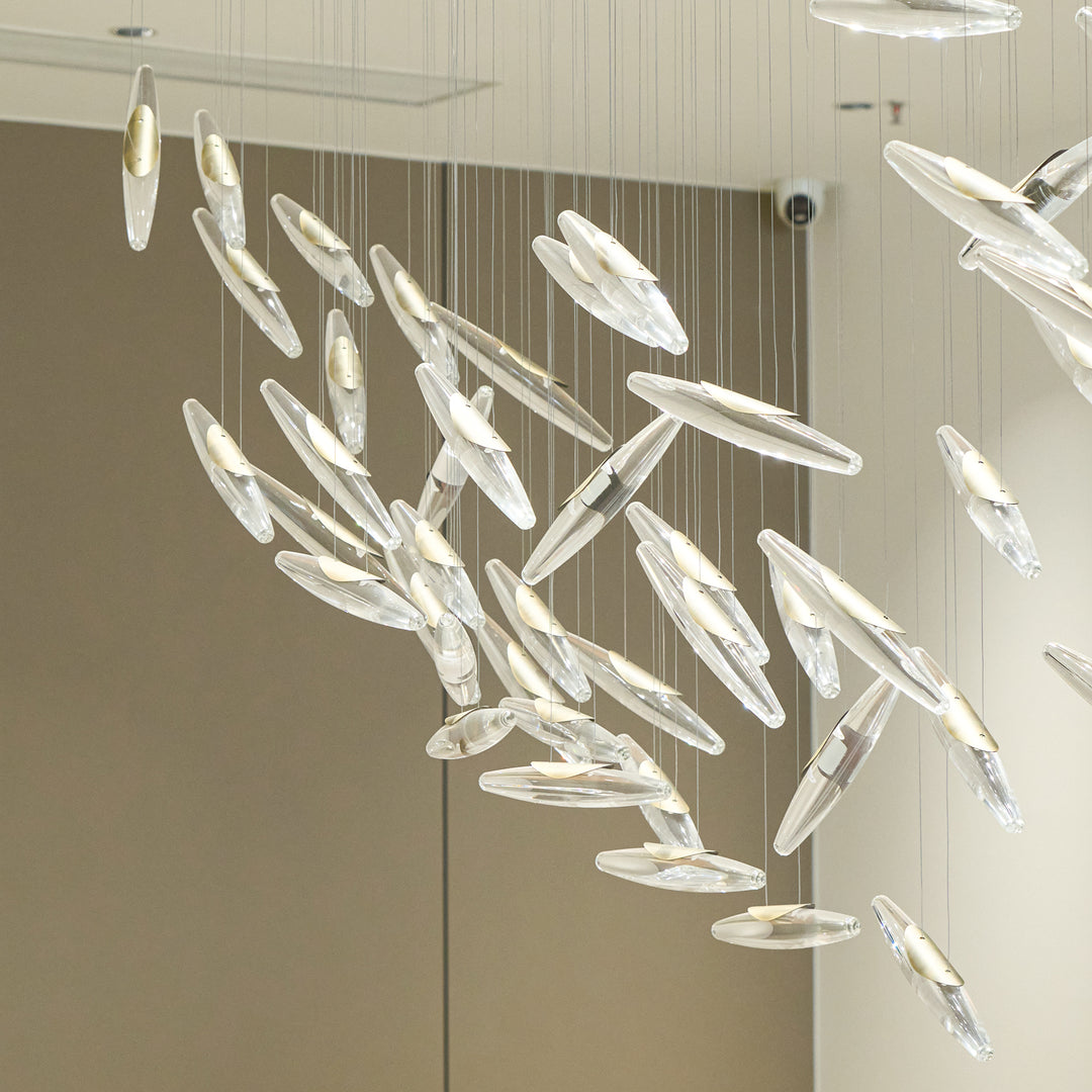 Illuminate your space with our Moonlight Whispers Chandelier. The delicate, suspended installation softly reflects light, casting a tranquil and ethereal ambiance. Perfect for creating a peaceful, calming atmosphere.