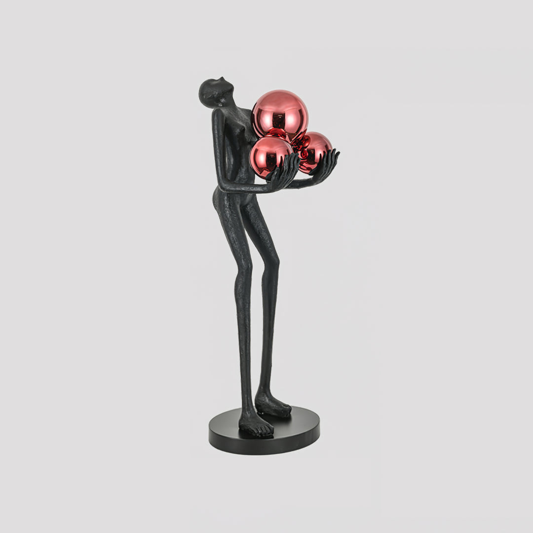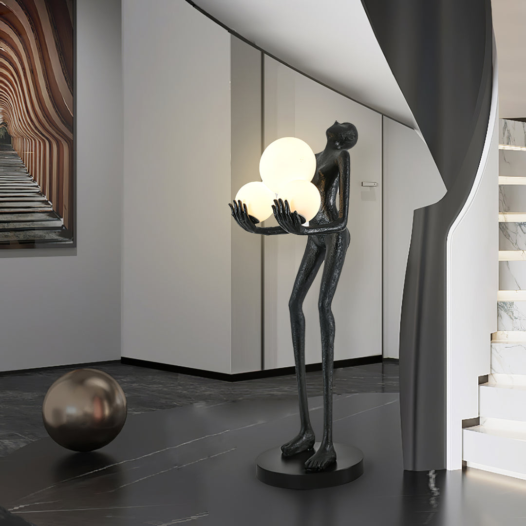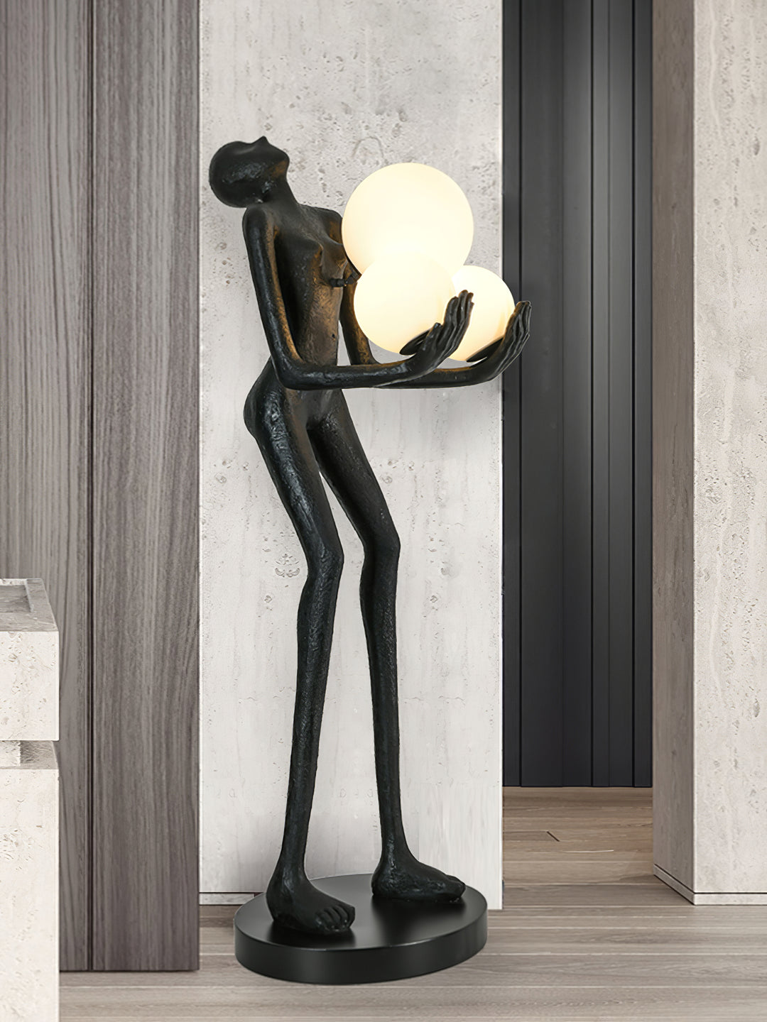 The Moonlit Guardian Floor Lamp is inspired by the protective and nurturing spirit of a celestial guardian. The figure is elegantly designed to cradle glowing orbs, evoking a sense of warmth and security. The textured black finish gives it a timeless, artistic appeal, making it a perfect addition to bedrooms, living rooms, or cozy reading nooks. The Moonlit Guardian Floor Lamp combines functionality with sculptural artistry, offering a soft, ambient light that enhances the atmosphere of any room.