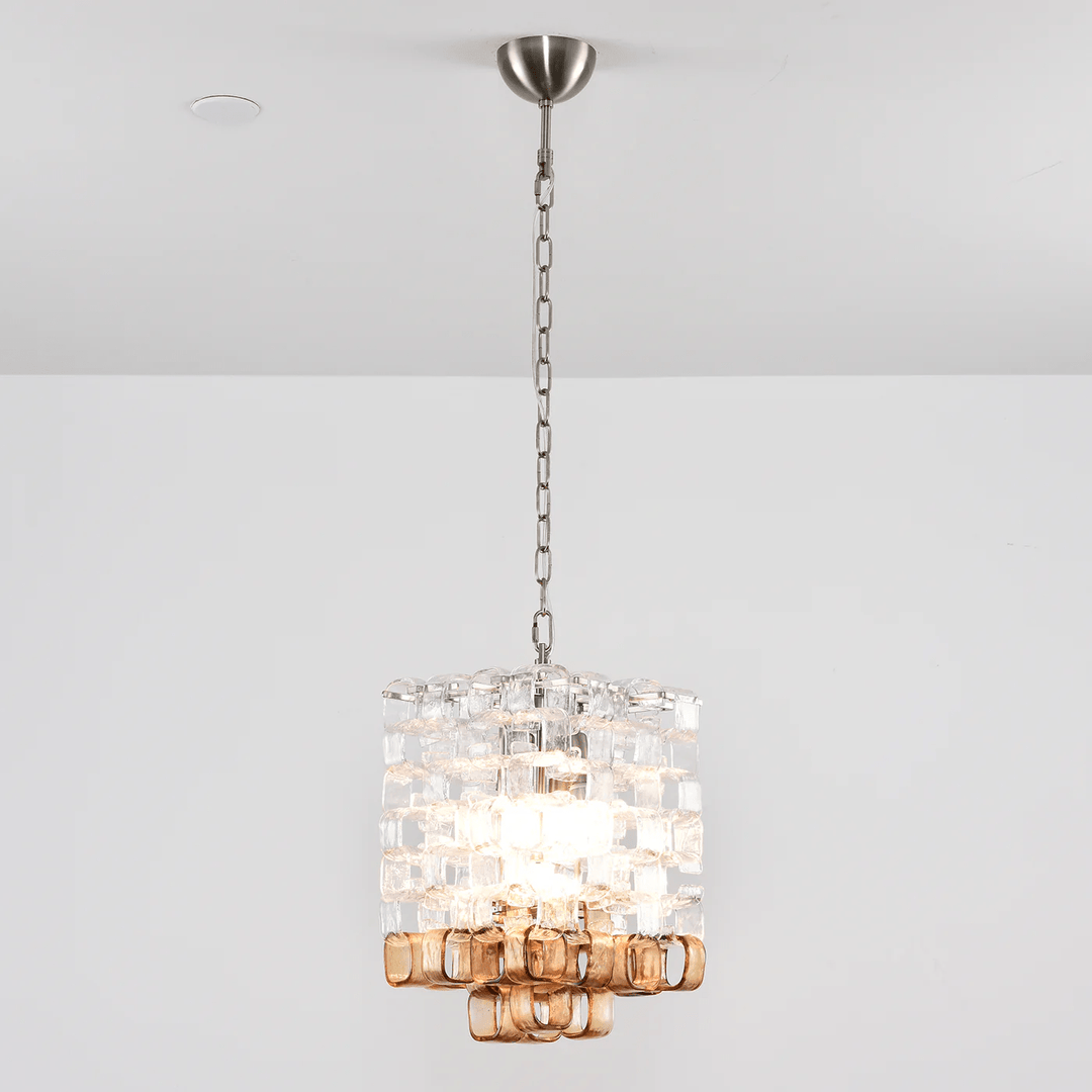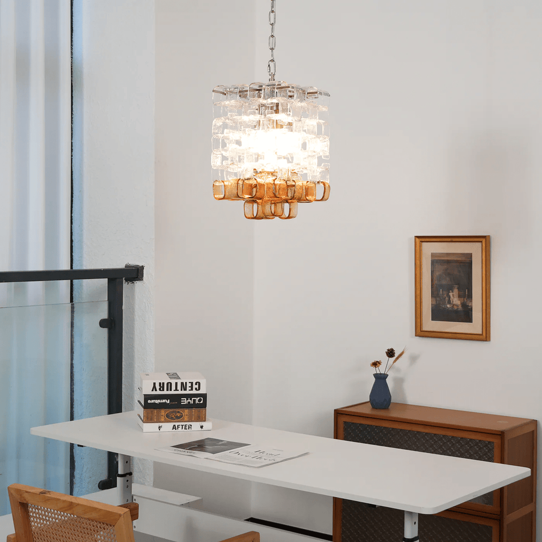 Illuminate your space with the Murano Poliarte Interlocking Chandelier. Made with amber and transparent Murano glass cups suspended on a chrome metal frame, the chandelier creates a stunning display of light and color. The cups can also be arranged individually for a customizable look. Experience the beauty of this intricate and versatile piece in any room.