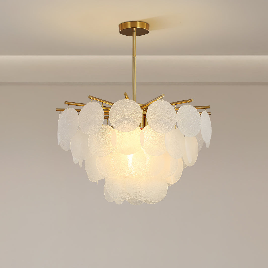 Each piece of glass is unique. The droplets are hand-formed by our artisans using a process where undulations and crystal-like textures form. The translucent glass is complemented and beautifully framed by the symmetrical metalwork. The light emitted is a warm, soft glow.