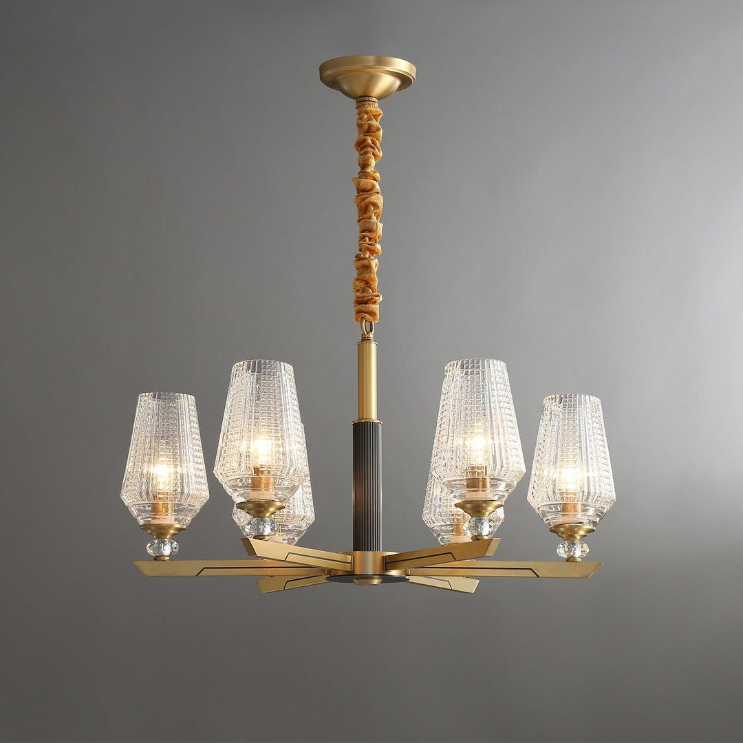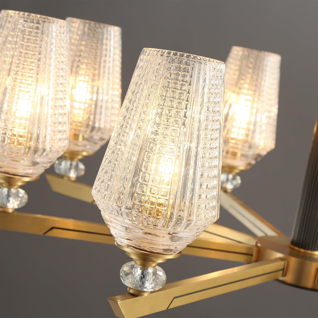 Concentric rings of faceted glass refract light inward and outward. Inspired by 20th century Austrian chandeliers, it pairs ribbed glass with a solid brass frame.The clear glass leaves have a relief on the outside and are shiny on the inside. The chandelier emits a stunning light.