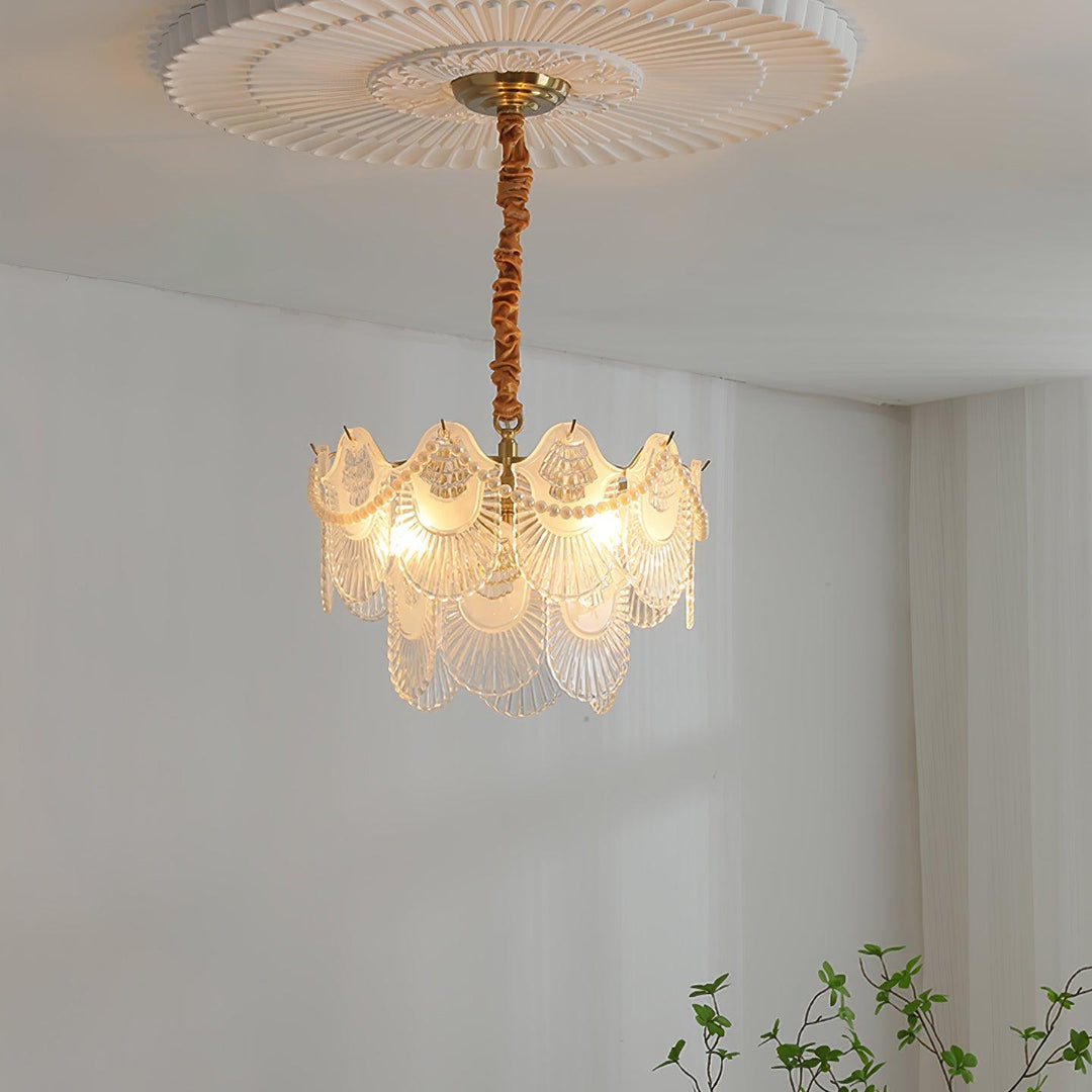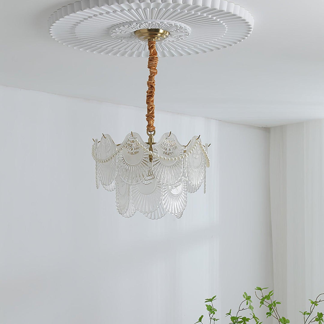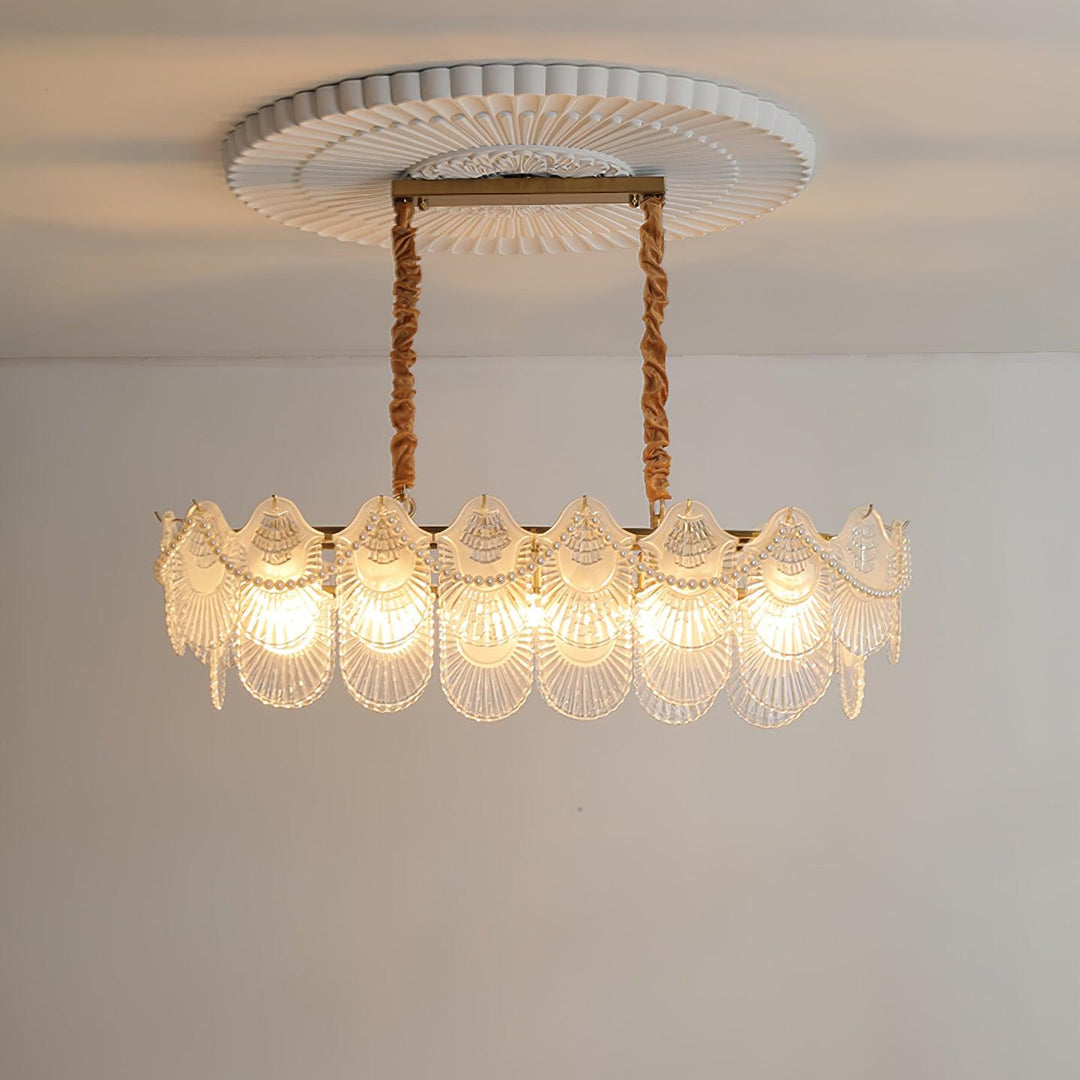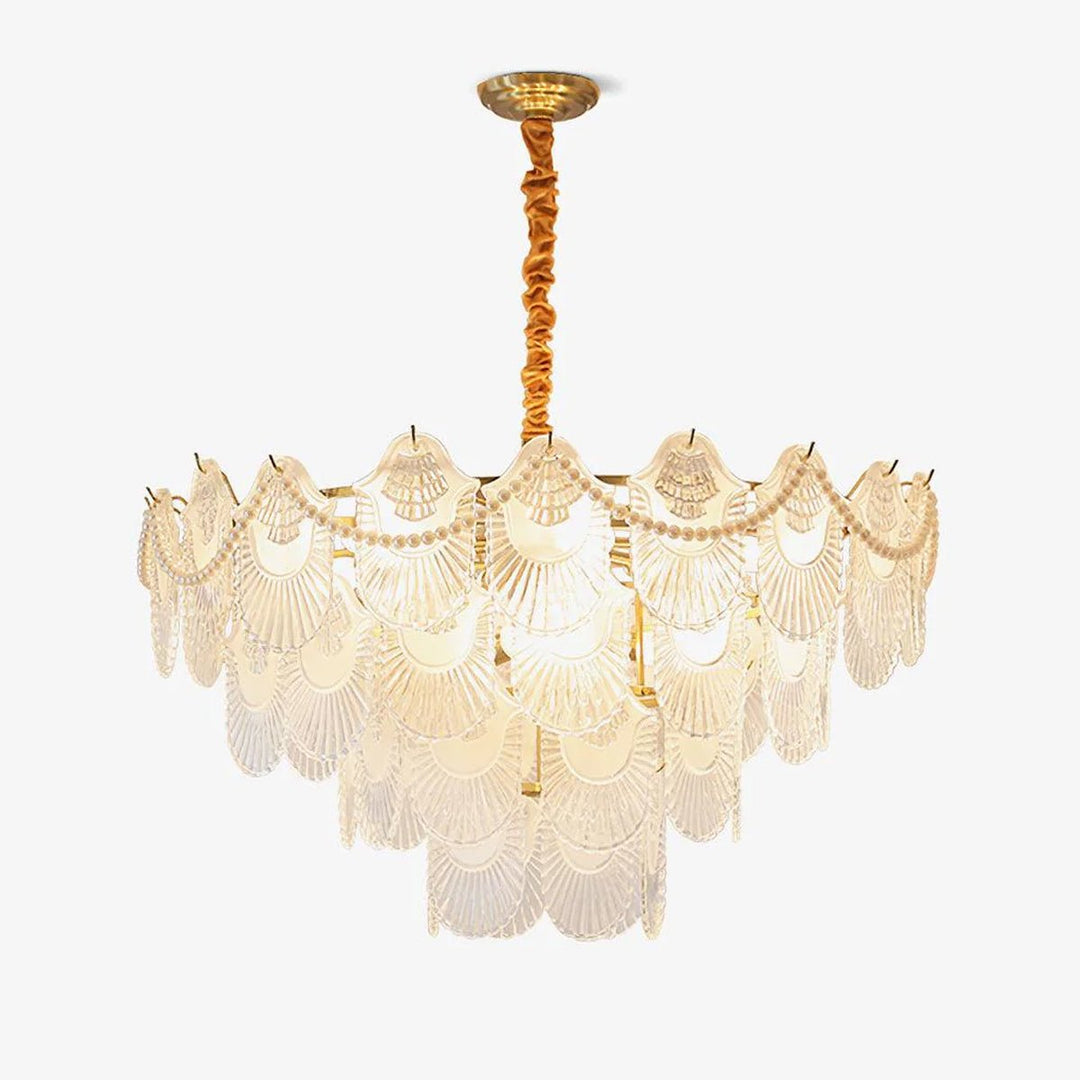 Our Pearl Glass Shell Chandelier is perfect for creating a dramatic and ambient atmosphere. Its beautiful design features glass shells to bring a unique, sophisticated look to any room. When lit, this chandelier makes a stunning statement. When off, this chandelier adds refined elegance to your space.